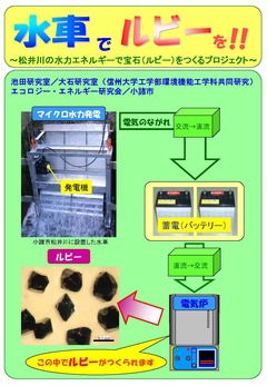 現在,小諸市松井川の小さい滝を利用してマイクロ水力発電の実証実験中です。この水車で発電した電力を利用してルビー(宝石)を作ります。電気はバッテ リーに蓄電し、電気炉内の温度を約1100度(従来の方法では2000度以上の高温が必要)にするだけで、炉内のルツボの中に六角両錐のルビーの結晶がで きます。