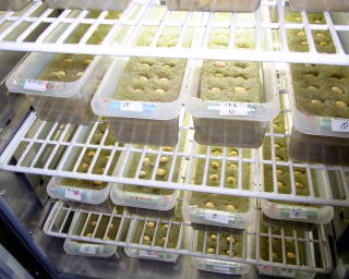 左から、長野市大岡での調査風景、昨年度(2009年)のダイズ畑とダイズのラボ実験