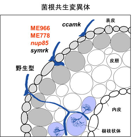 ます。私たちは、菌根・根粒共生を支える宿主因子群の一端を分子レベルで解明するため、ミヤコグサから単離された共生変異体nup85や新規共生変異体の機能解析を行っています。
