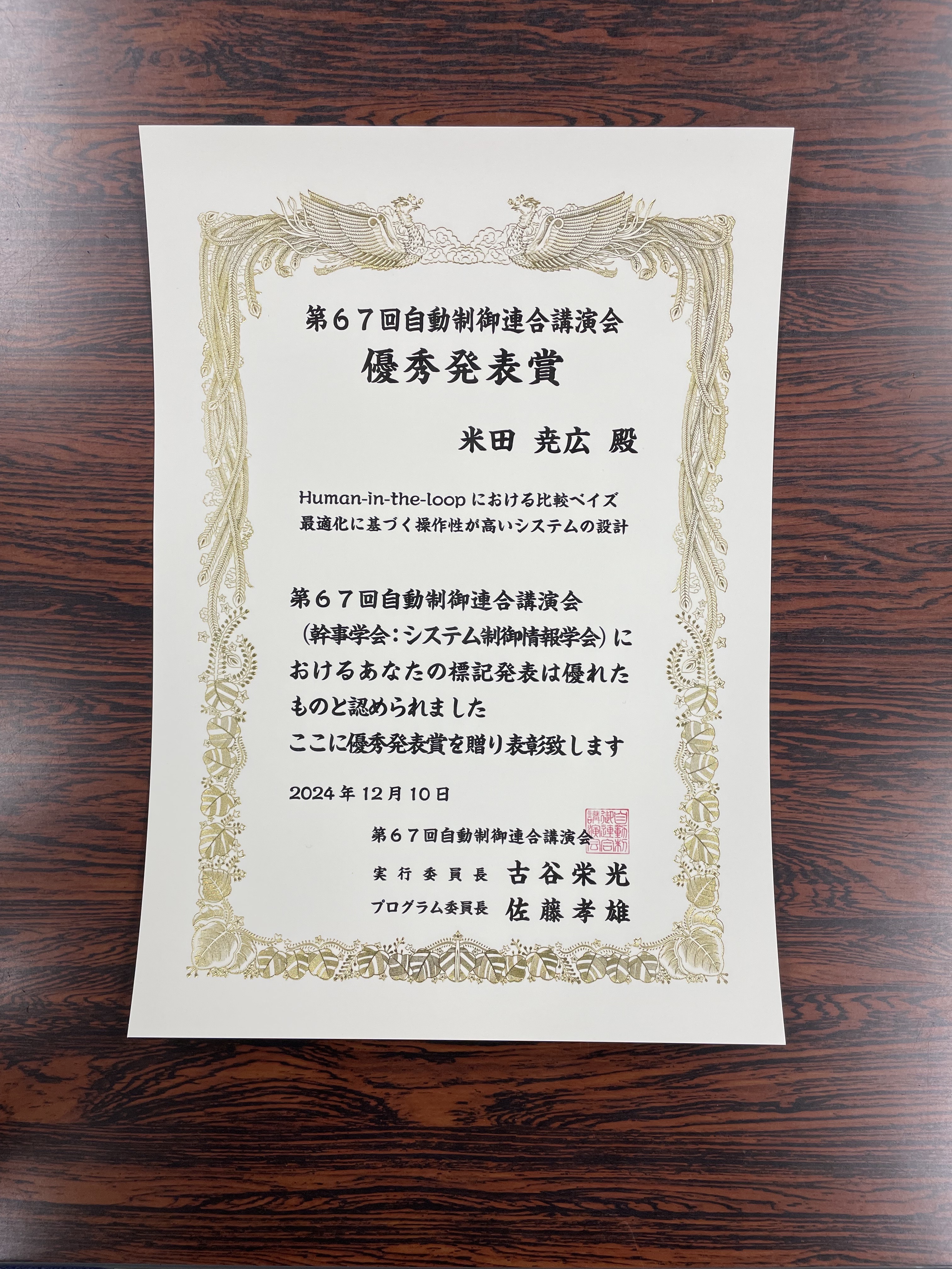 修士2年 米田 尭広: 第67回自動制御連合講演会 優秀発表賞 受賞(2024年12月10日)