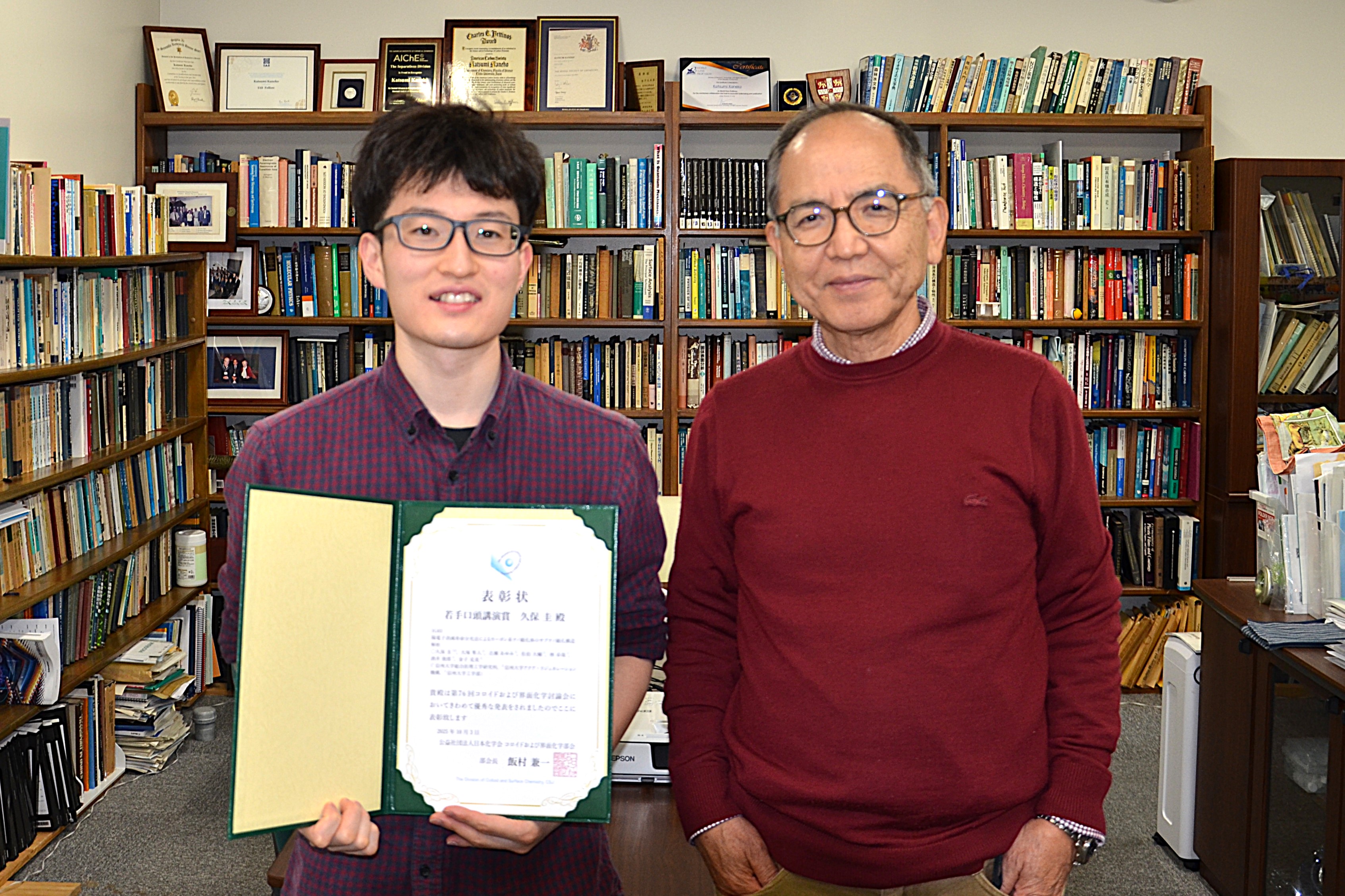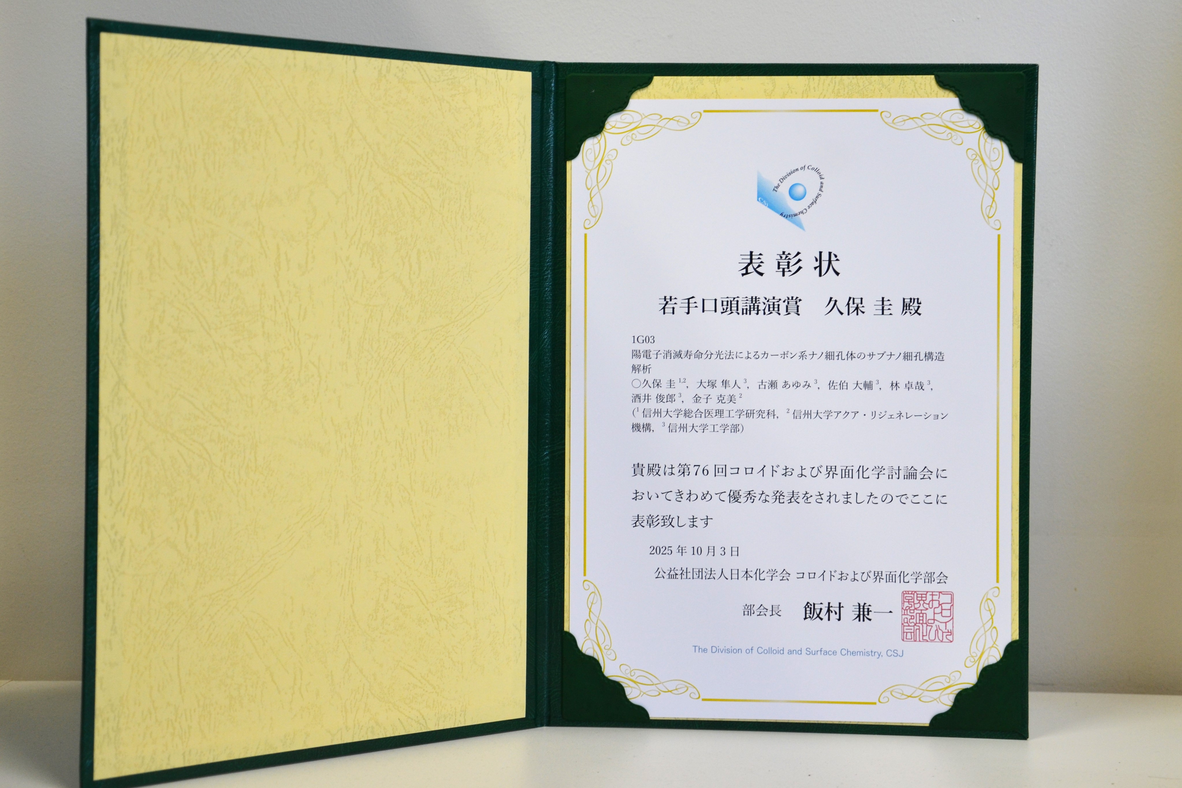 Mr. K. Kubo (PhD student) was awarded to Oral Presentation Award for Young Scientist at the 76th Divisional Meeting of Division of Colloid and Surface Chemistry, Chemical Society of Japan (第76回コロイドおよび界面化学討論会、日本化学会)on September 22-25. His presentation title was “Subnano-scale pore analysis of porous carbon with PALS method” (「陽電子消滅寿命分光法によるカーボン系ナノ細孔体のサブナノ細孔構造解析」). Application of advanced carbon material to energy technologies has requested an accurate understanding of nanostructures in carbon materials. Mr. K. Kubo clearly showed that positron annihilation lifetime spectroscopy (PALS) can be applied to carbon materials through determination of the key parameter 𝜹. The 𝜹 for carbon is 0.23 nm, being larger than well-known 𝜹 for Si-based materials ( 0.18 nm). The application of PALS using 𝜹=𝟎.𝟐𝟑 𝐧𝐦 to reduced graphene oxide evidenced the presence of void spaces in 0.12 nm size which cannot be detected by Ar adsorption at 87 K. [Photo1] [Photo2]