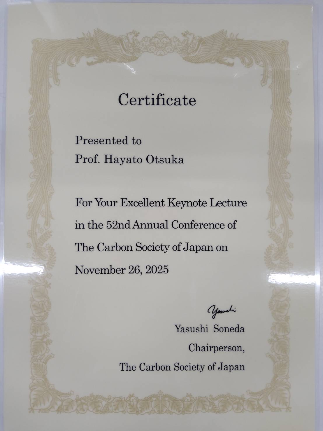 Dr. Hayato Otsuka was awarded to NF Foundation R&D Encouragement Award in 21th November 2025. The innovation title is “Energy friendly production of oxygen-enriched air with graphene-wrapped zeolite membranes of ultra-high speed separation”.