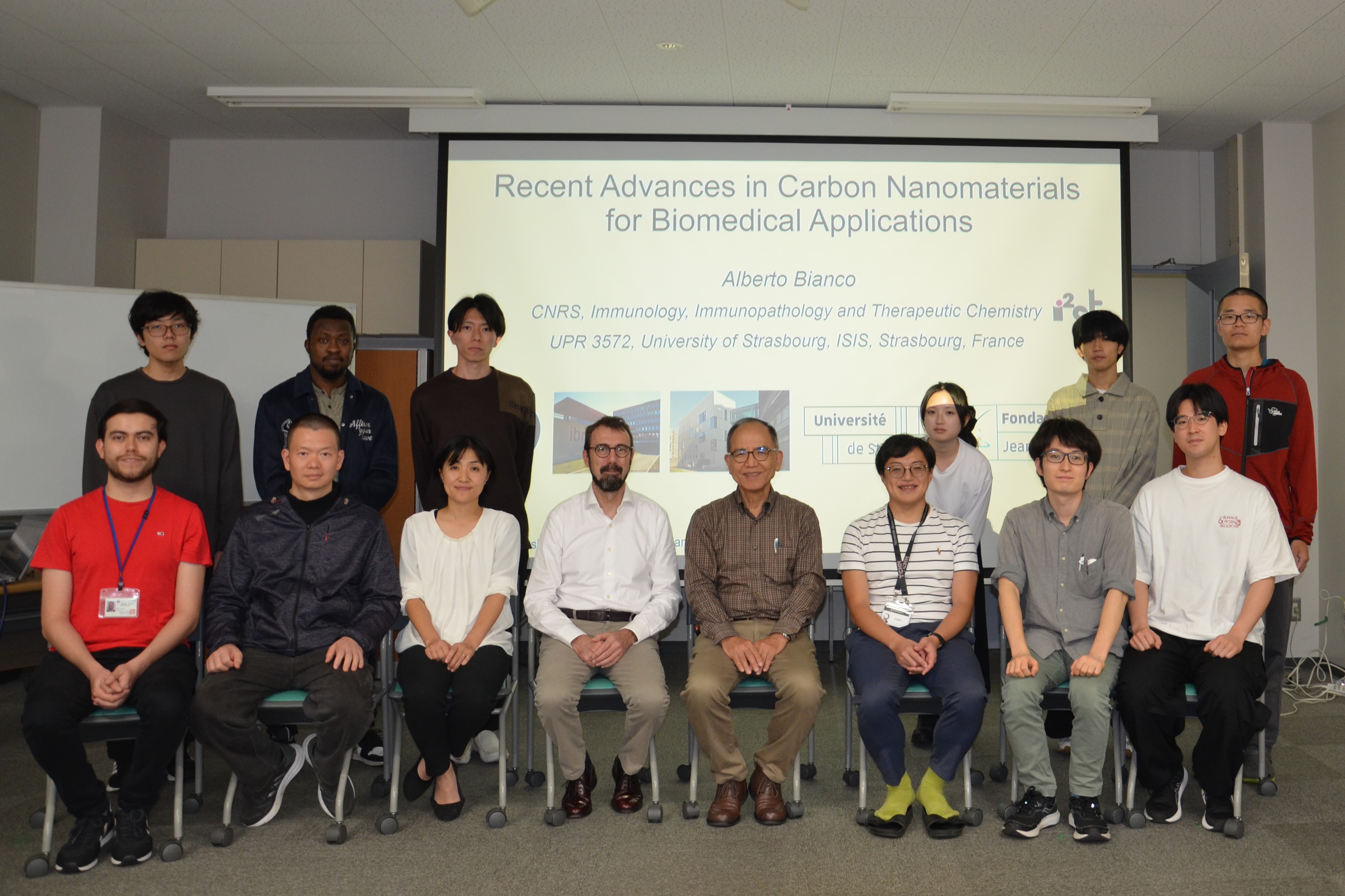 Professor Alberto Bianco introduced their recent research topics on medical application potentials of nanostructured carbons such as carbon nanodots, graphene oxide, graphene, and carbon nanotube. In particular, he showed the marked effect of designed chemical modification of these nanostructured carbons on degradation of cancer cells.