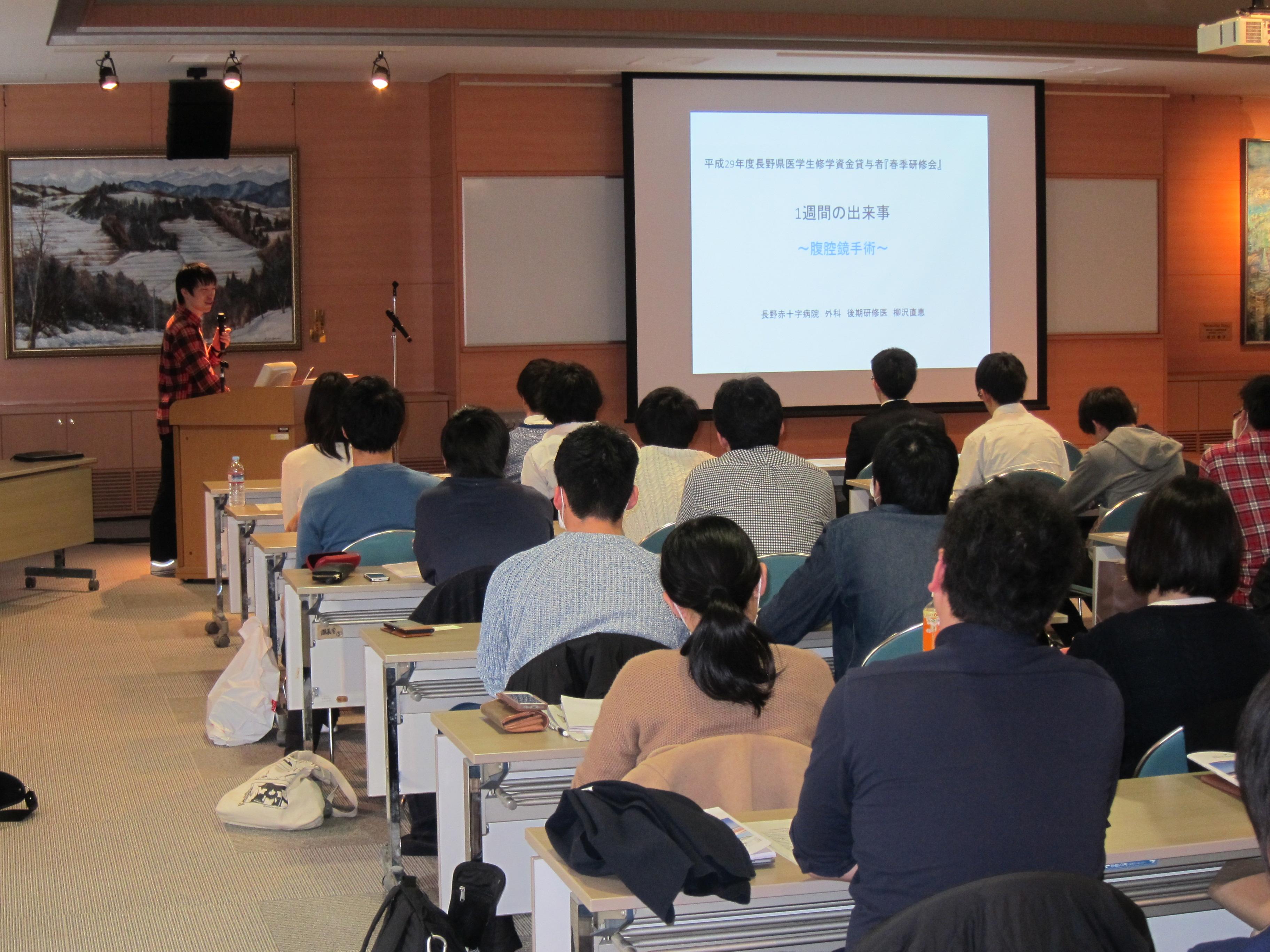 長野赤十字病院副院長の和田秀一先生による病院紹介に引き続いて、修学資金貸与で長野赤十字病院血液内科にて専門研修中の植松望武先生と同院外科で同じく研修中の柳沢直恵先生に、現在の研修についてお話いただきました。