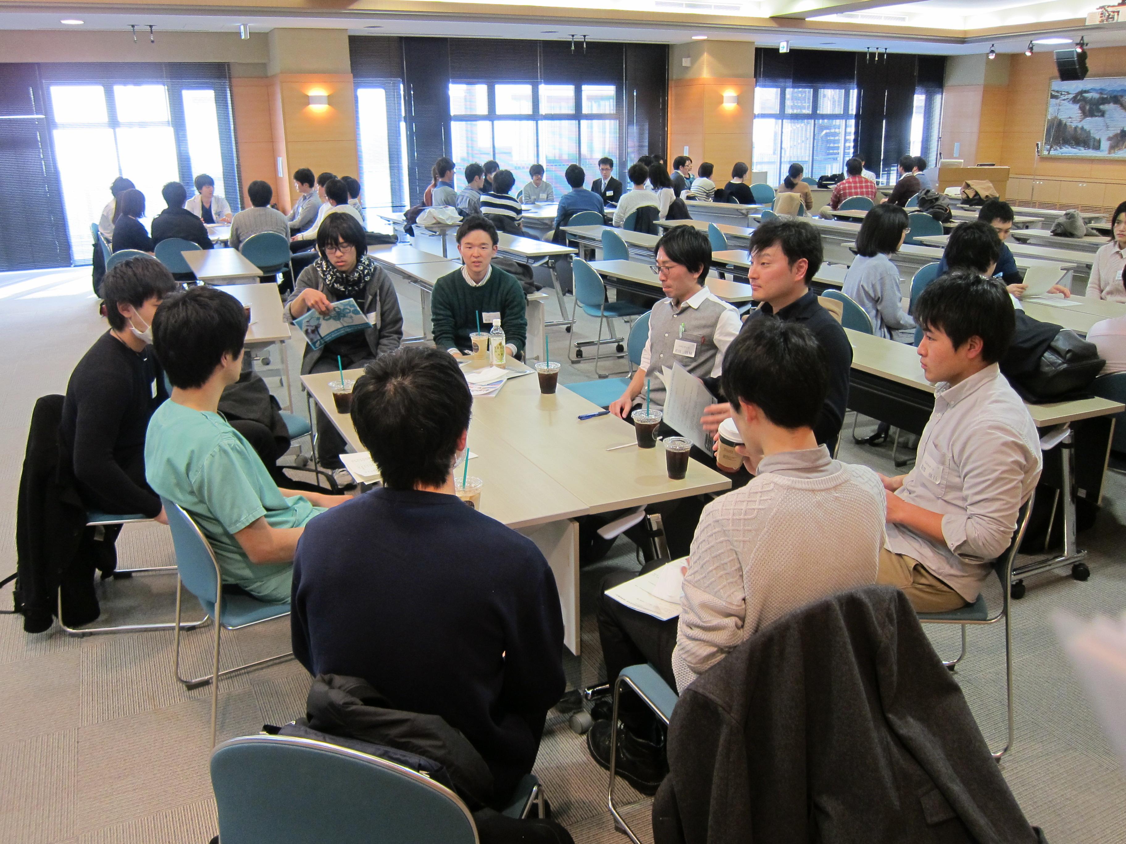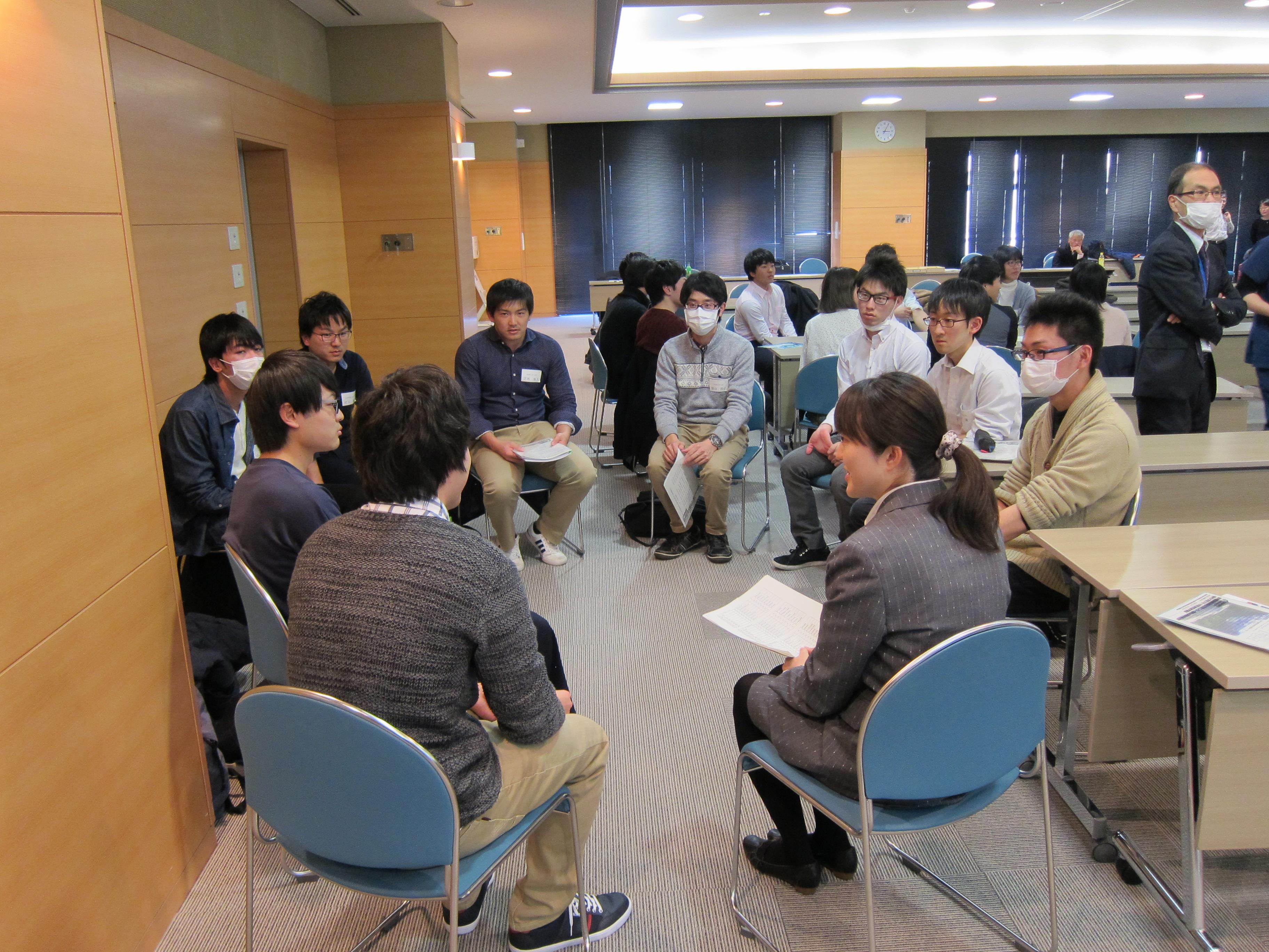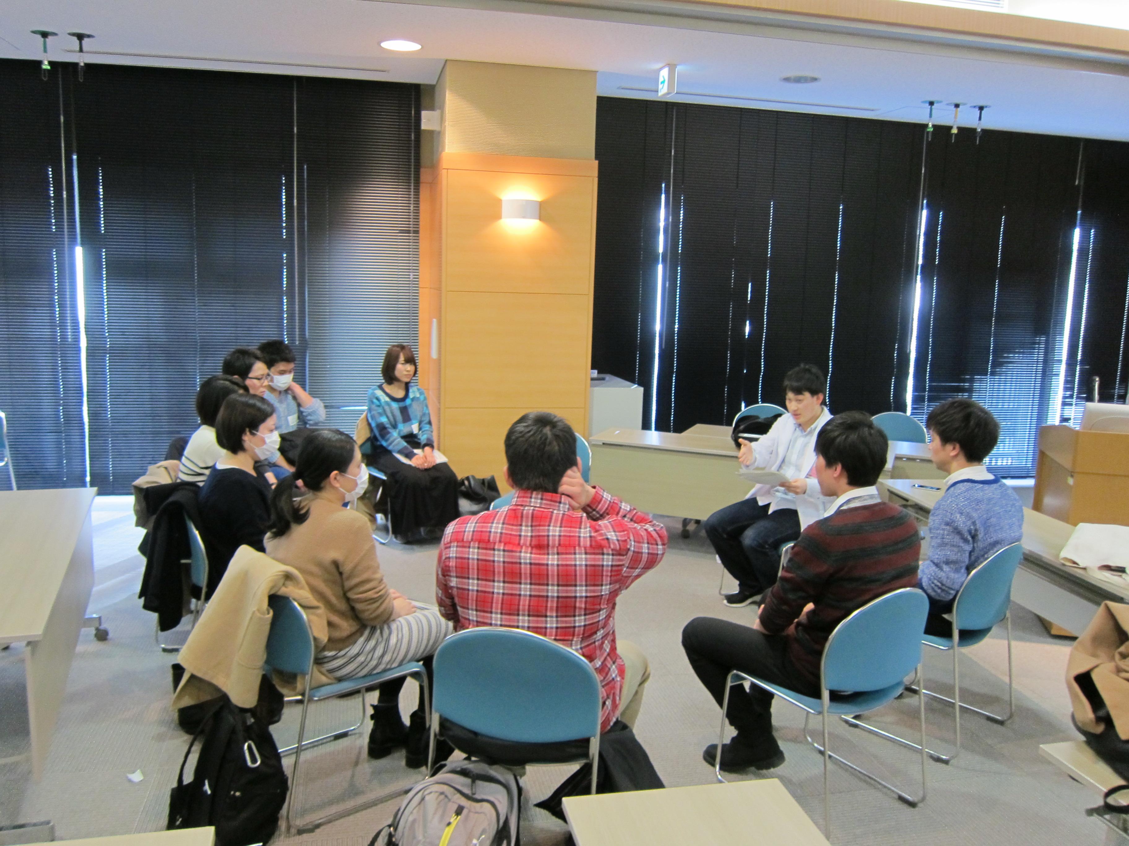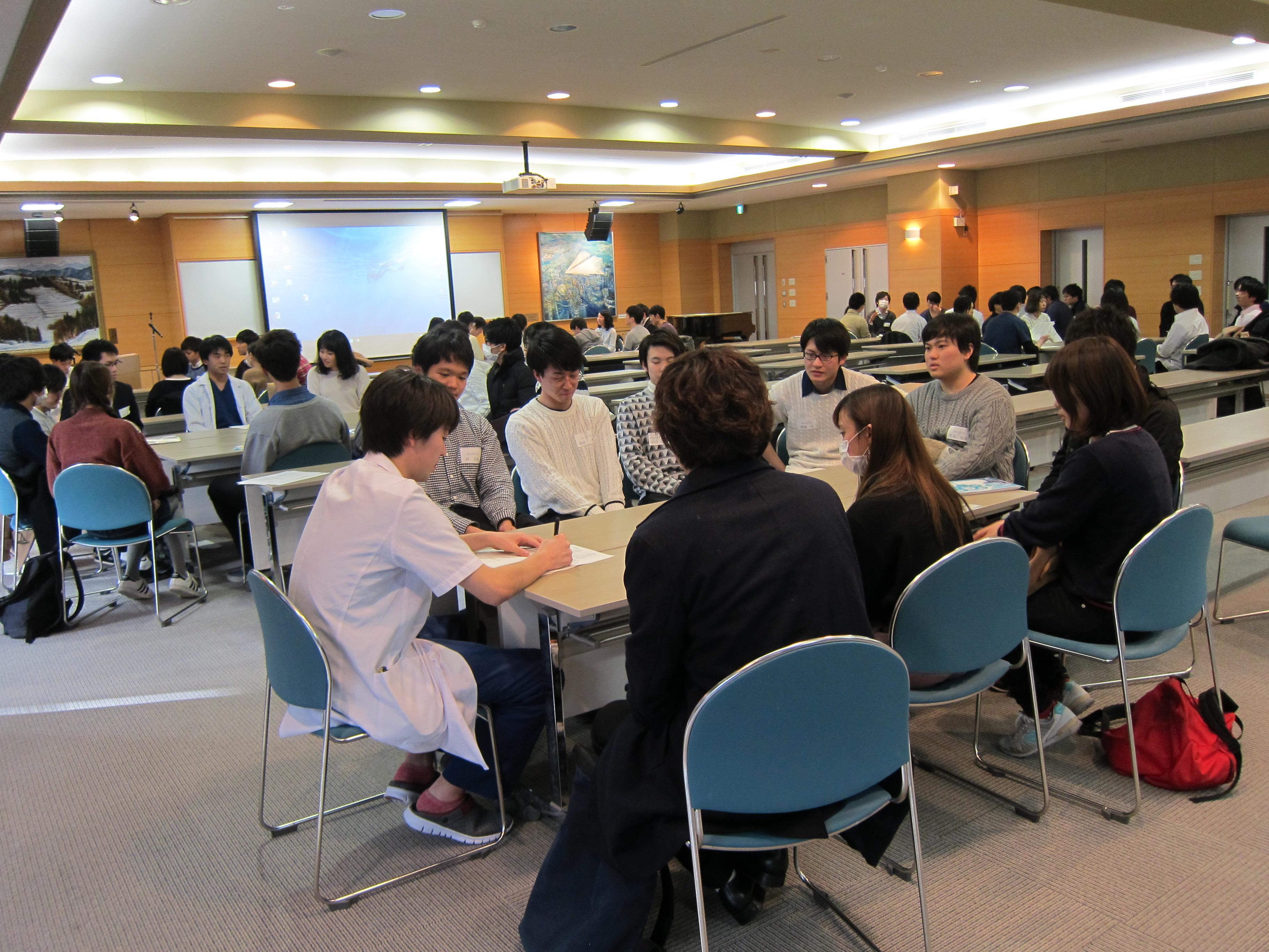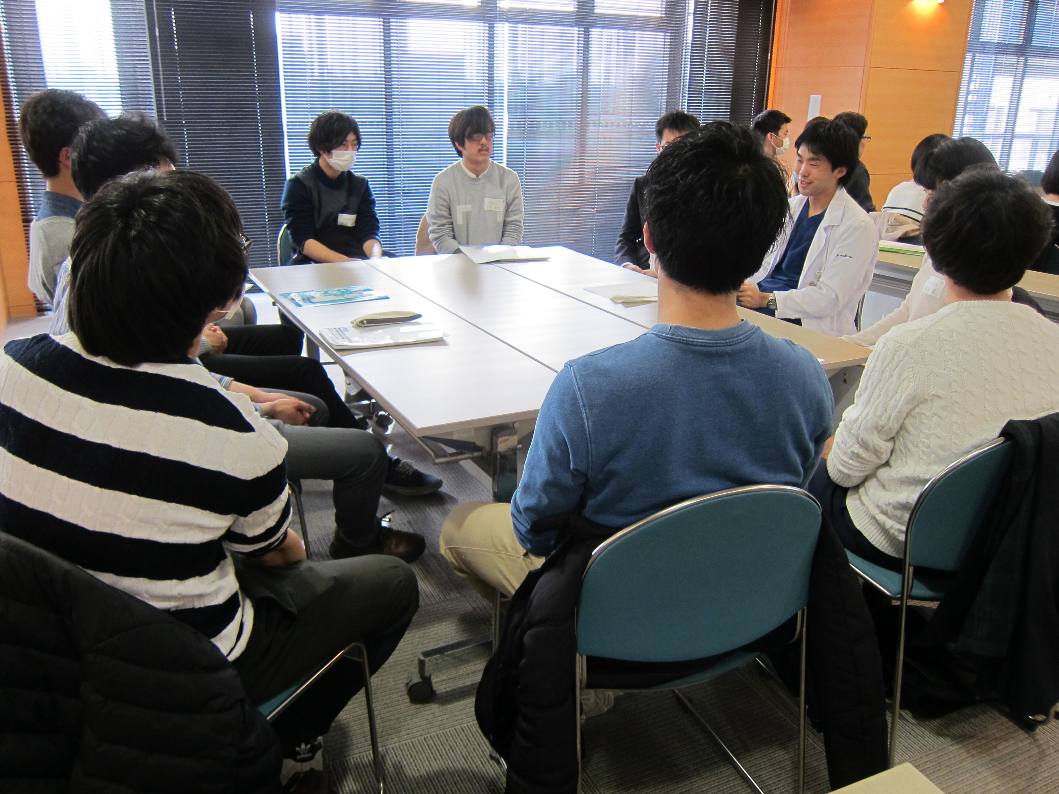 その後、参加学生は7グループに分かれ、それぞれのグループで現在長野赤十字病院にて初期・専門研修中の先生方(貝梅紘子先生、柳沢直恵先生、植松望武先生、中野祐太先生、増子真嗣先生、黒岩正嗣先生、大澤由寛先生)と研修病院決定、診療科決定、信大、長野日赤の研修の実際、日々の生活などについて懇談、意見交換を行いました。