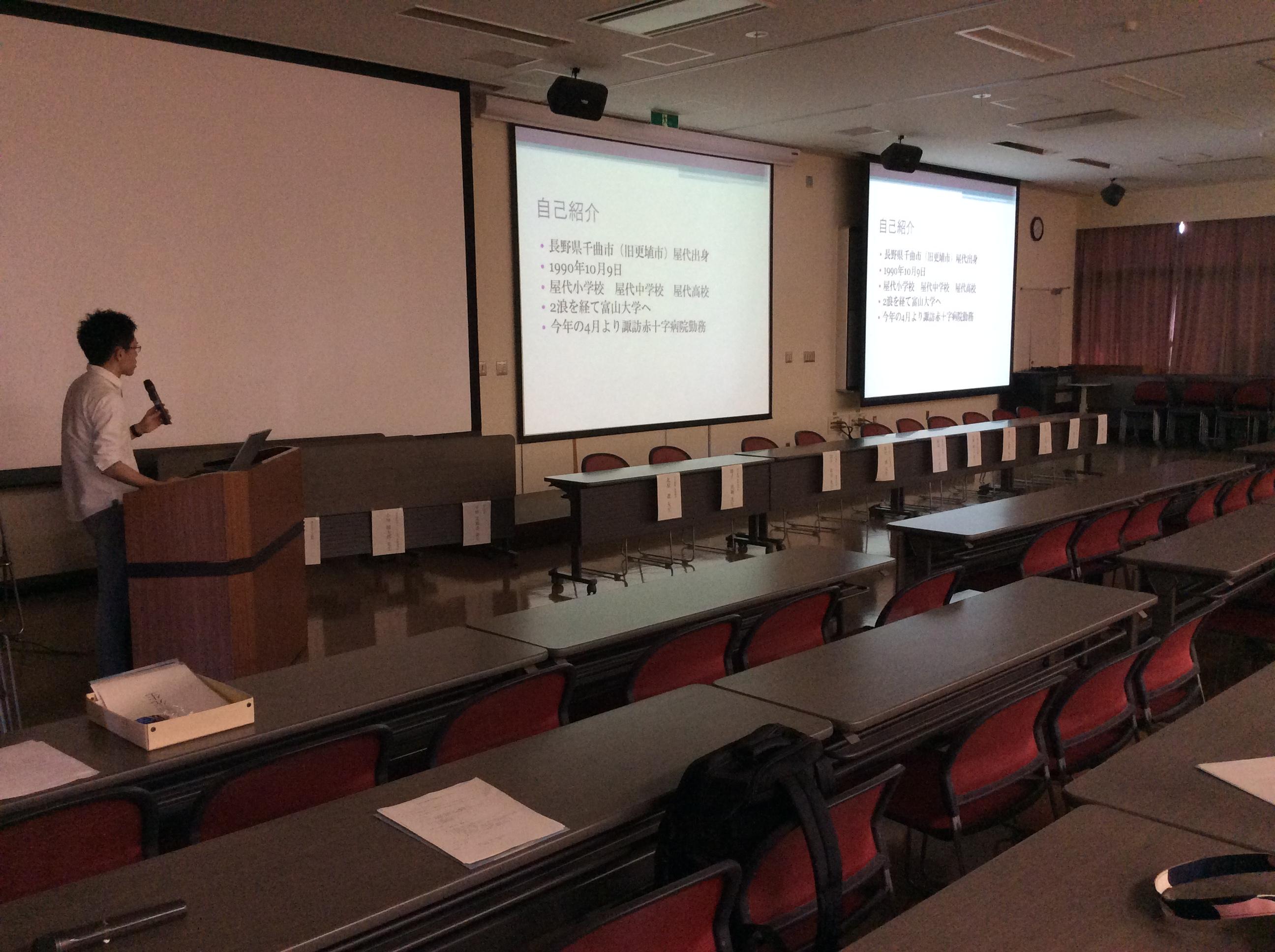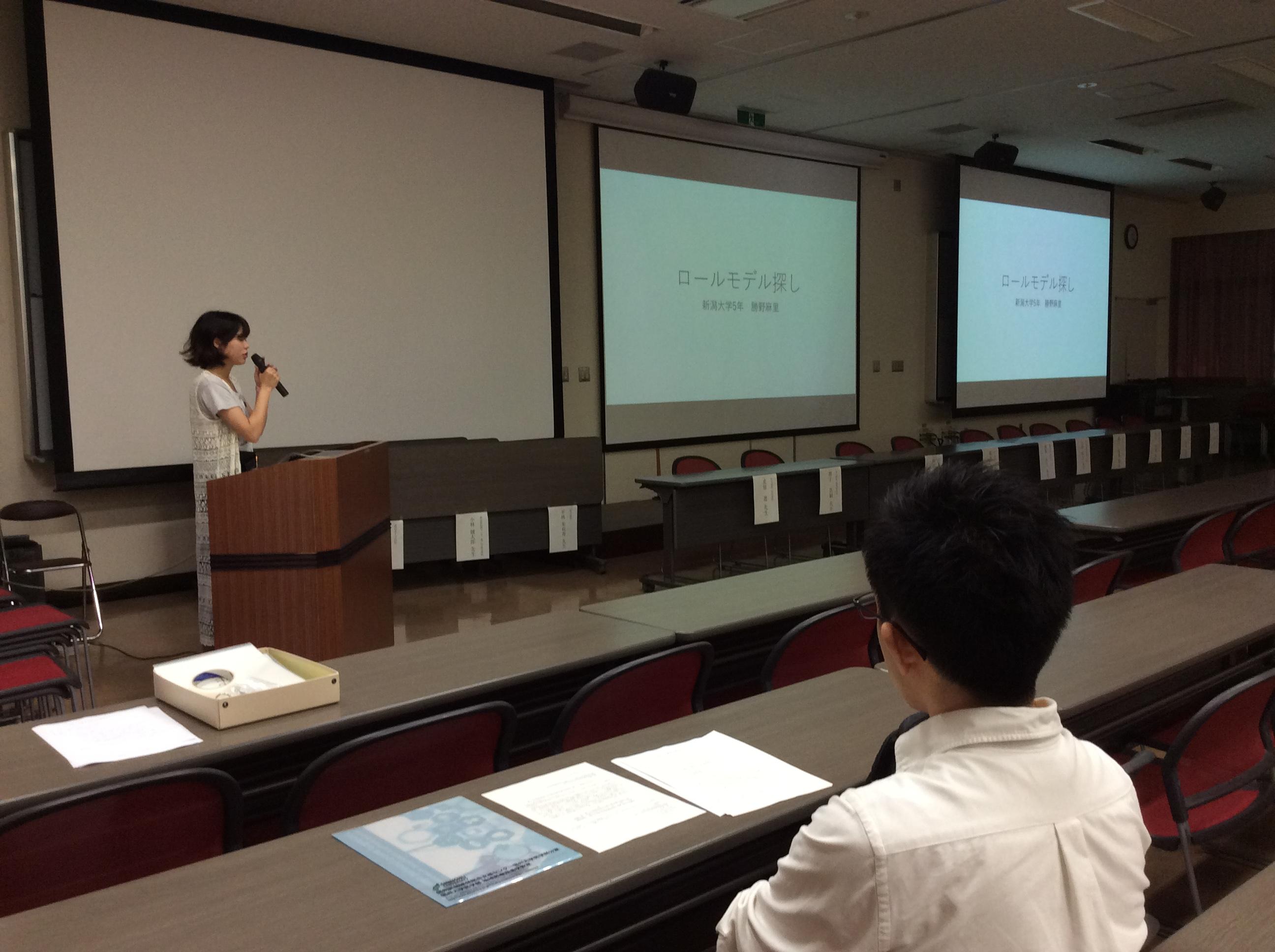 最初のプログラムとして、新潟大学5年の勝野麻里さんと諏訪赤十字病院初期研修1年目の井出翔吾先生に、これまでの歩み、大学での勉強、研修、修学資金制度に対しての意見・思いなどについて発表をお願いしました。