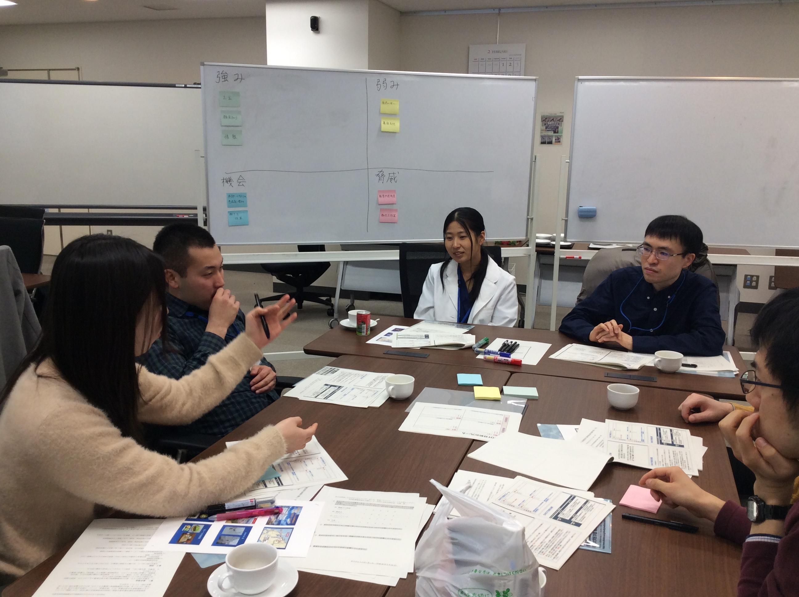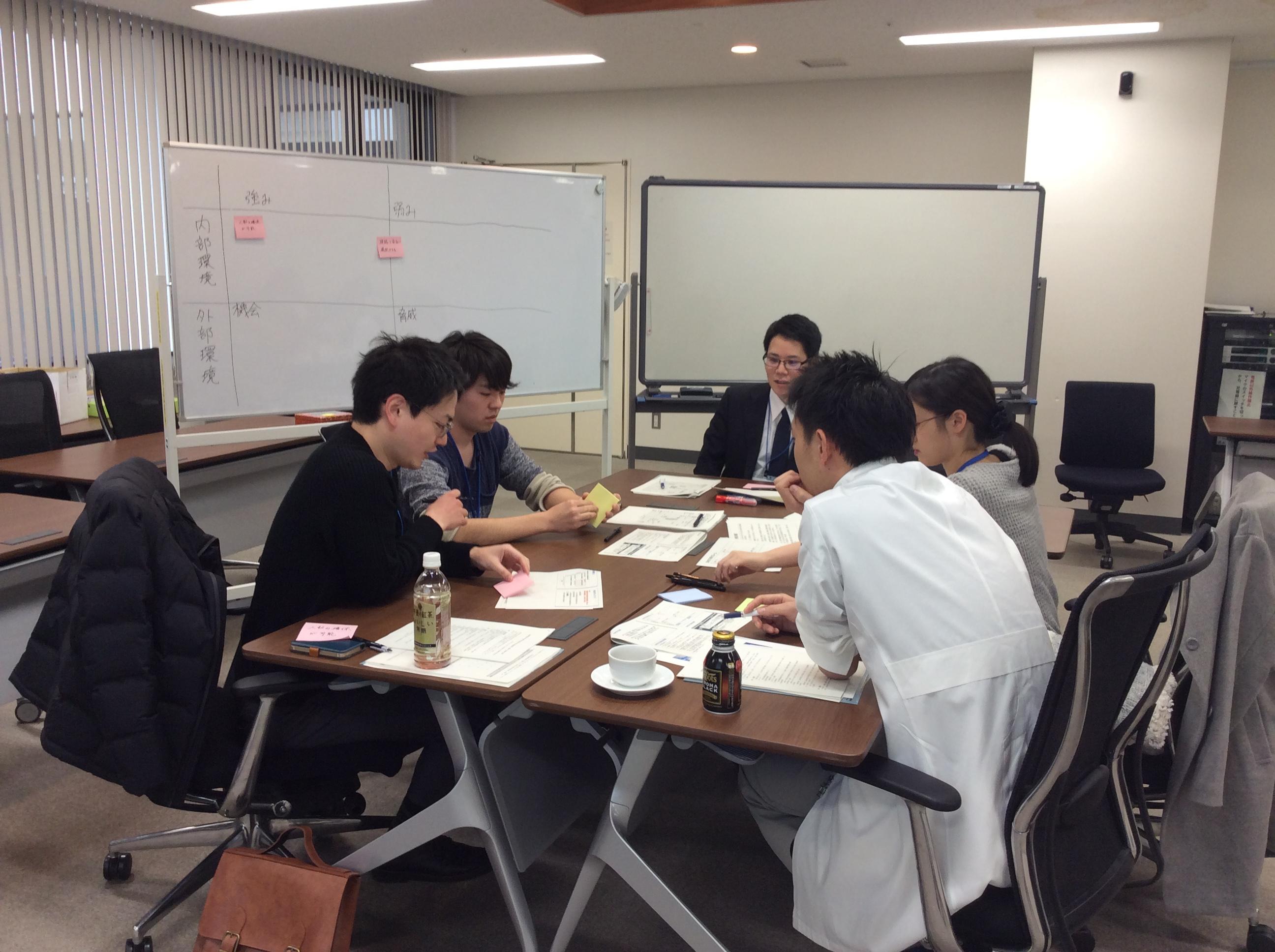 平成30年2月25日(日)に信州大学医学部附属病院外来棟中会議室にて、第一回長野県医学生修学資金貸与医師の集いが開催されました。県内5病院より16名の参加がありました。飯山赤十字病院院長の古川賢一先生の「多職種訪問チームによる訪問診療で在宅での看取りを支える」と題した講演に引き続いて(資料1)、3グループに分かれて長野県医学生修学資金制度ならびに長野県医学生修学資金貸与者の組織の分析、ならびに、その課題について、SWOT分析・クロスSWOT分析を用いて検討しました(資料2、3、4)。