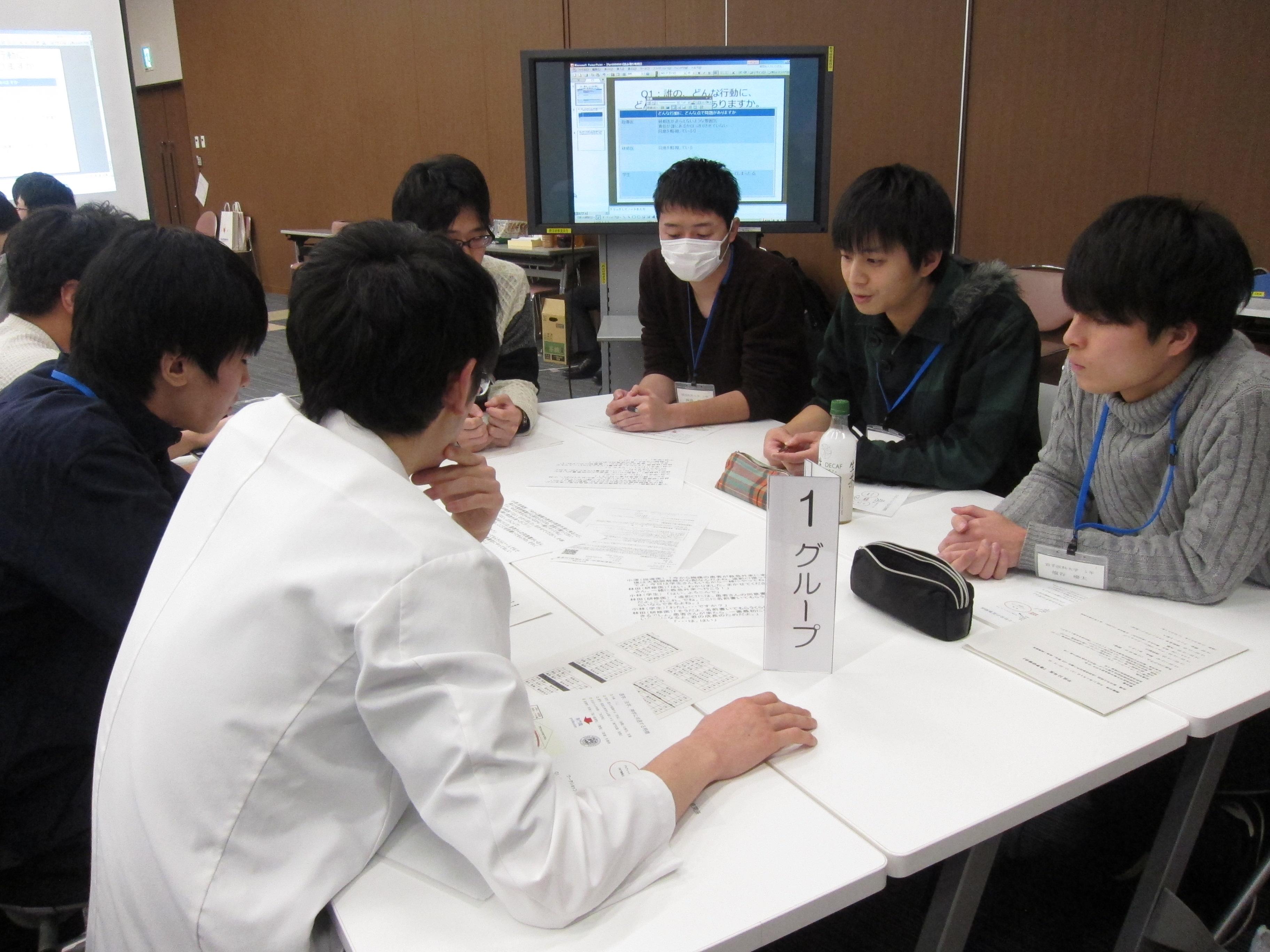 堀米直人病院長のご挨拶と、総合内科・臨床研修センター長の白籏久美子先生による病院紹介に引き続いて、6グループに分かれそれぞれのグループに若手医師1名が加わり(修学資金貸与先輩医師の小児科大澤先生、形成外科横山先生も)プロフェッショナリズムをテーマとしたワークショップを行いました。