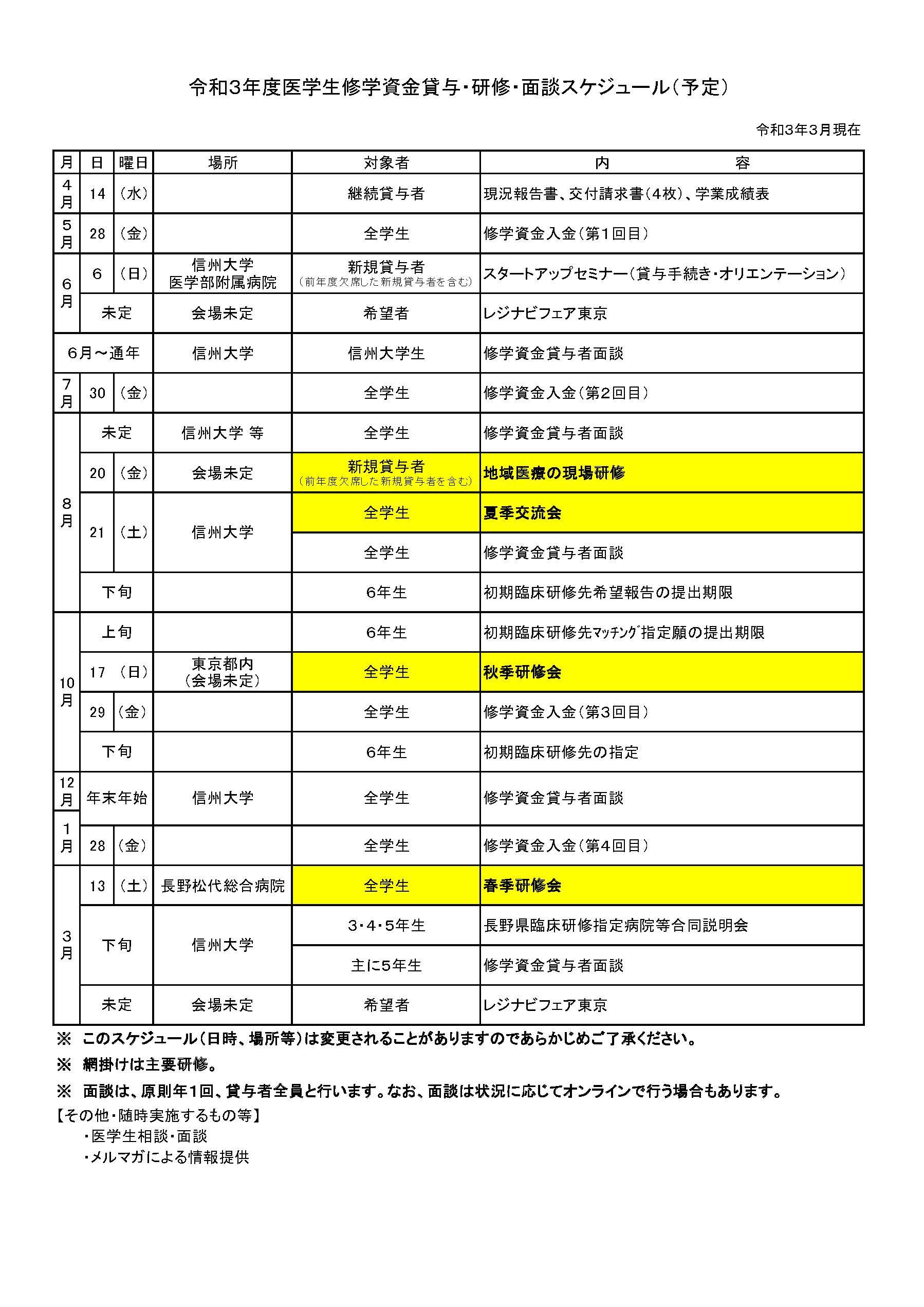 令和3年度医学生修学資金貸与・研修・面談スケジュール(予定)