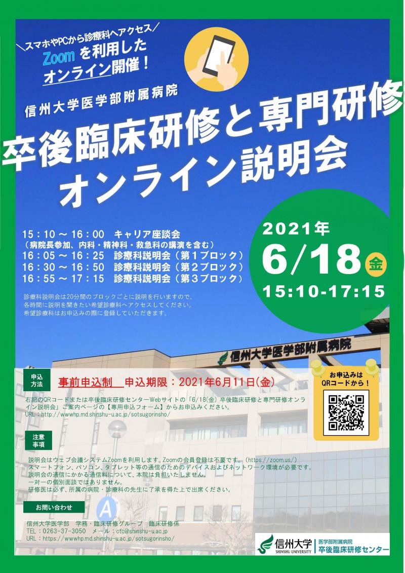 2021年6月18日(金) 信州大学医学部附属病院「卒後臨床研修と専門研修オンライン説明会」開催のお知らせ