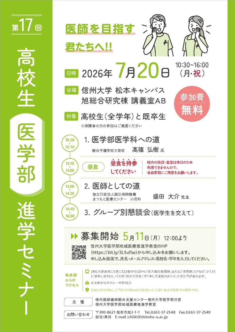 このセミナーは、多くの高校生が、医学部医学科進学を目指すよう意識を高め、将来的に多くの医師が長野県に定着することを目標としています。