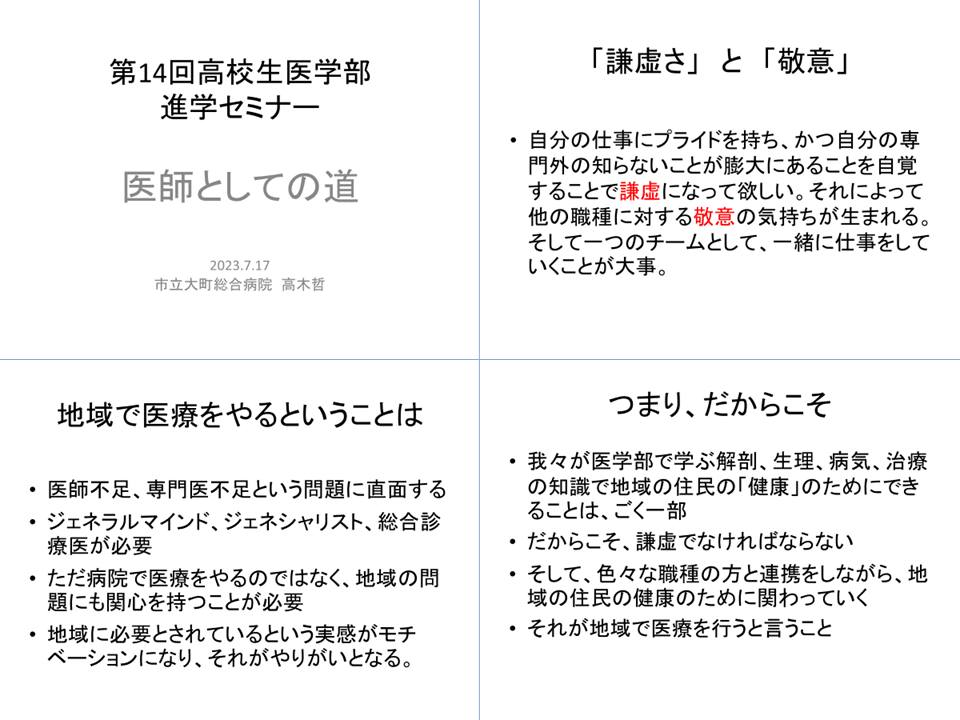 自分の県の医療は様々な問題に直面していると実感した。時代に合わせて医療は変化しなければいけないものだと思うので、先生のように課題解決に積極的に取り組めるようになりたいと思った。