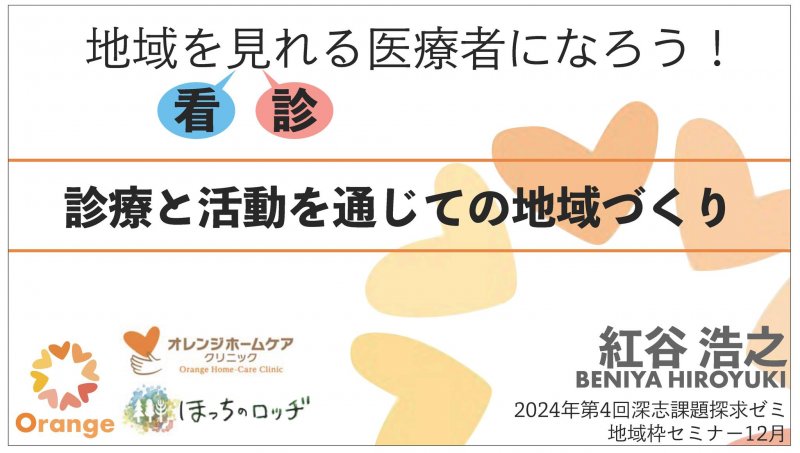 12月7日(土)に開催の地域枠セミナー12月・2024年深志課題探究ゼミ④では、オレンジホームケアクリニック・ほっちのロッヂの代表の紅谷浩之先生を講師にお迎えして「診療と活動を通じての地域づくり」と題してお話しいただきました。