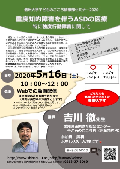 2020年10月~2021年3月までの 本田秀夫教授の講演の受付を、2019年12月1日~28日にいたします。子どものこころの発達医学教室宛(souko@shinshu-u.ac.jp)にメールでお申し込みご相談ください。予定が埋まり次第、締め切らせていただきます。(2019.10 .25 )
