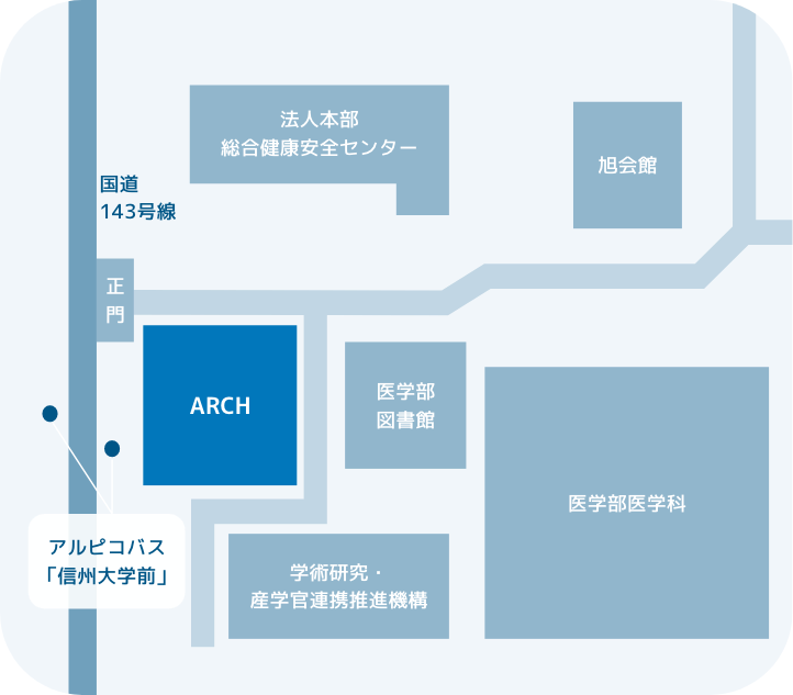 JR松本駅お城口(東口)23番のりばから「信大横田循環線」または「浅間線」(アルピコバス)に乗車し約15分、