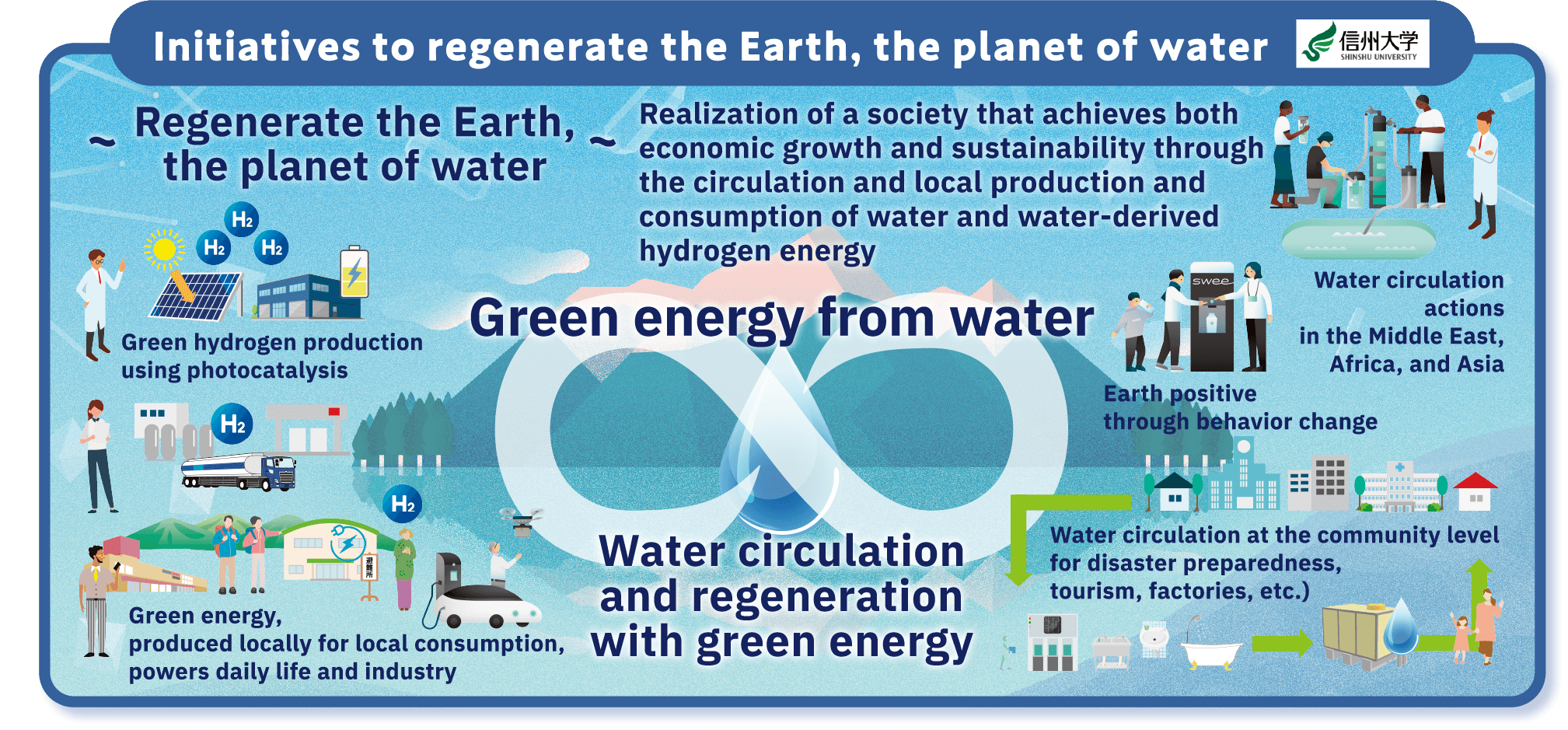 Shinshu University has established a system to promote research from a global perspective, focusing on cutting-edge materials research related to water purification and water-derived hydrogen energy, in which the university has a world-class track record. In cooperation with local governments and the industrial sector, we are also establishing a demonstration town that utilizes circular, locally produced and locally consumed water and water-derived hydrogen energy and other related technologies to support prosperous lifestyle and industries. Through these efforts, we aim to contribute to the achievement of both global environmental restoration and economic growth.