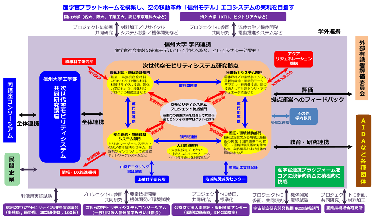 次世代空モビリティシステム研究拠点では、これまで航空宇宙システム研究拠点で培った研究シーズをベースに、承継教員ならびに特任教員を再配置して組織体制を構築し、次世代空モビリティシステムや宇宙産業の要素技術と技術認証に繋がる環境試験技術の開発、要素技術を統合した実機試作と実証試験など研究開発を推進し、さらには前身の航空宇宙システム研究拠点と同様、学部・大学院教育(共同研究講座、教育プログラム)と、リカレント教育(社会人スキルアップコースプログラム特別の課程、小中学生アウトリーチ活動など)による人材育成にも主体的に関わり、産学官が連携して空の移動革命「信州モデル」エコシステムを創出するプラットフォームの形成を目指します。次世代空モビリティや宇宙産業の研究シーズを産学官が連携して社会実装を推進するという方向性は、信州大学社会実装研究クラスターのミッションにも適合するものです。