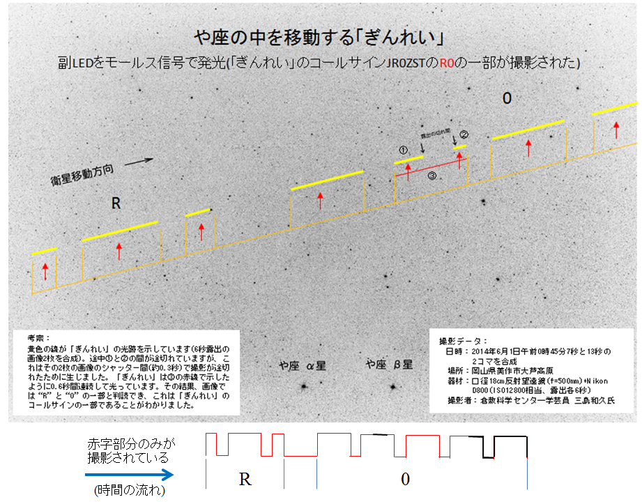 - 第30回LED点灯実験(8月28日午後10時台のパス)。可視地域は関東地方。事前タイマーセット。モールス。「ぎんれい」と同時に打ち上げられた「TeikyoSat-3」開発の帝京大学の学生の協力を得て観測が行われたが、当夜も天候に恵まれずLED光が確認できませんでした。
