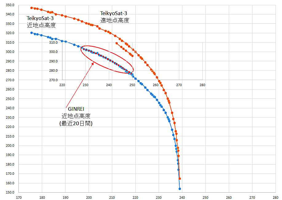 TeikyoSat-3は平成26年10月25日に大気圏に再突入しましたが、近地点高度約320kmからの高度変化を図に示します。その図に、GINREIの最近20日間の降下カーブを同じ高度でほぼ一致する場所に重ねると、31日ずれた経過日数になります。