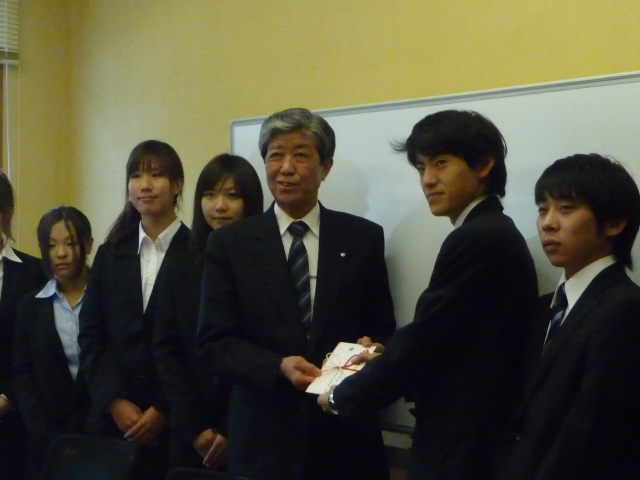 高等教育コンソーシアム信州加盟大学の学生同士が、遠隔講義システムを利用し交流活動を行っています。平成24年度は、交流会に参加している大学祭実行委員の学生から、7大学合同(大学祭が4月に終了していた松本歯科大学を除く)で何か企画をできないかとのアイデアが出され、長野県北部地震(平成23年3月12日発生)の被災地である栄村の復興を支援する目的で、「AID to SAKAE~信州の絆を見せよう~」というスローガンのもと、各大学の大学祭において募金活動を行いました。