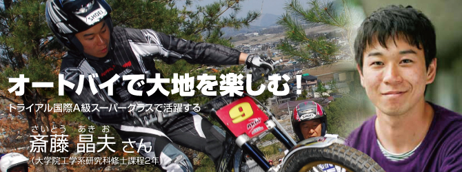 斎藤晶夫さんは、10歳でバイクに乗り始め、11歳でトライアルの世界へ。昨年1月からは国内最高峰の国際A級スーパークラスで活躍している。大学院生として研究課題に取り組みながら、全国各地でのレースに参戦。