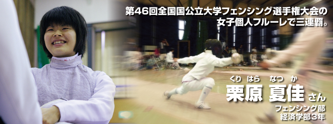 フェンシング部の栗原さんは8月23~28日に東北大学(仙台市)で行われた第46回全国国公立大学フェンシング選手権大会の個人フルーレで、大会史上初の三連覇を果たした。さらに、男子団体もフルーレ、エペ、サーブルの3部門を制し、総合優勝をとげた。