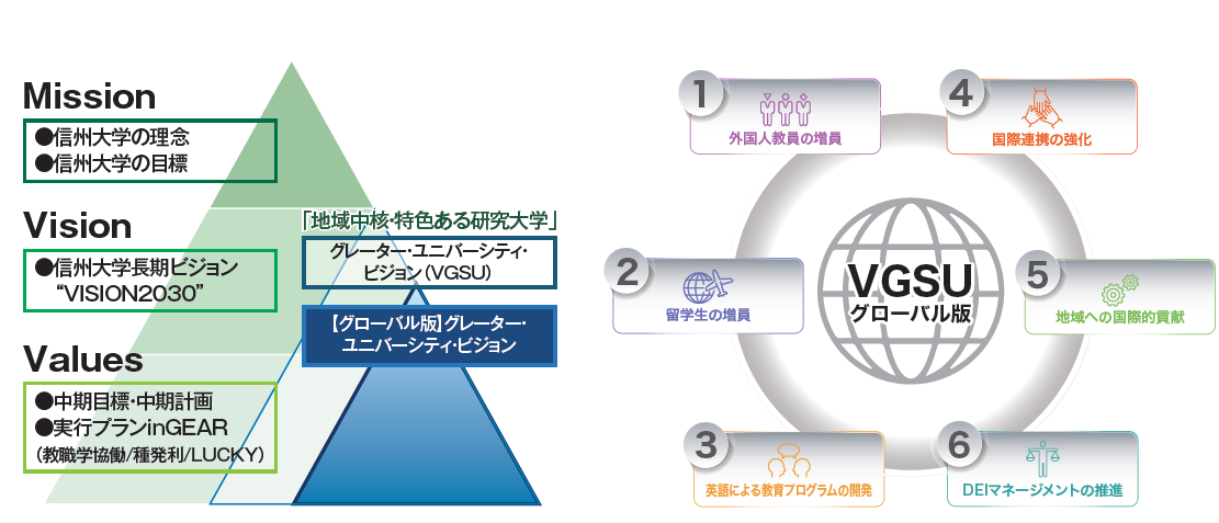 ※6)「VGSU(Vision for Greater Shinshu University)グローバル版:信州大学では、圏域を越えた広域連携により新たな価値創出を目指す経営ビジョン「VGSU」を2023年に策定し、2024年にはこれをベースに特にグローバル化についての基本理念を掲げた「VGSUグローバル版」を策定しています。