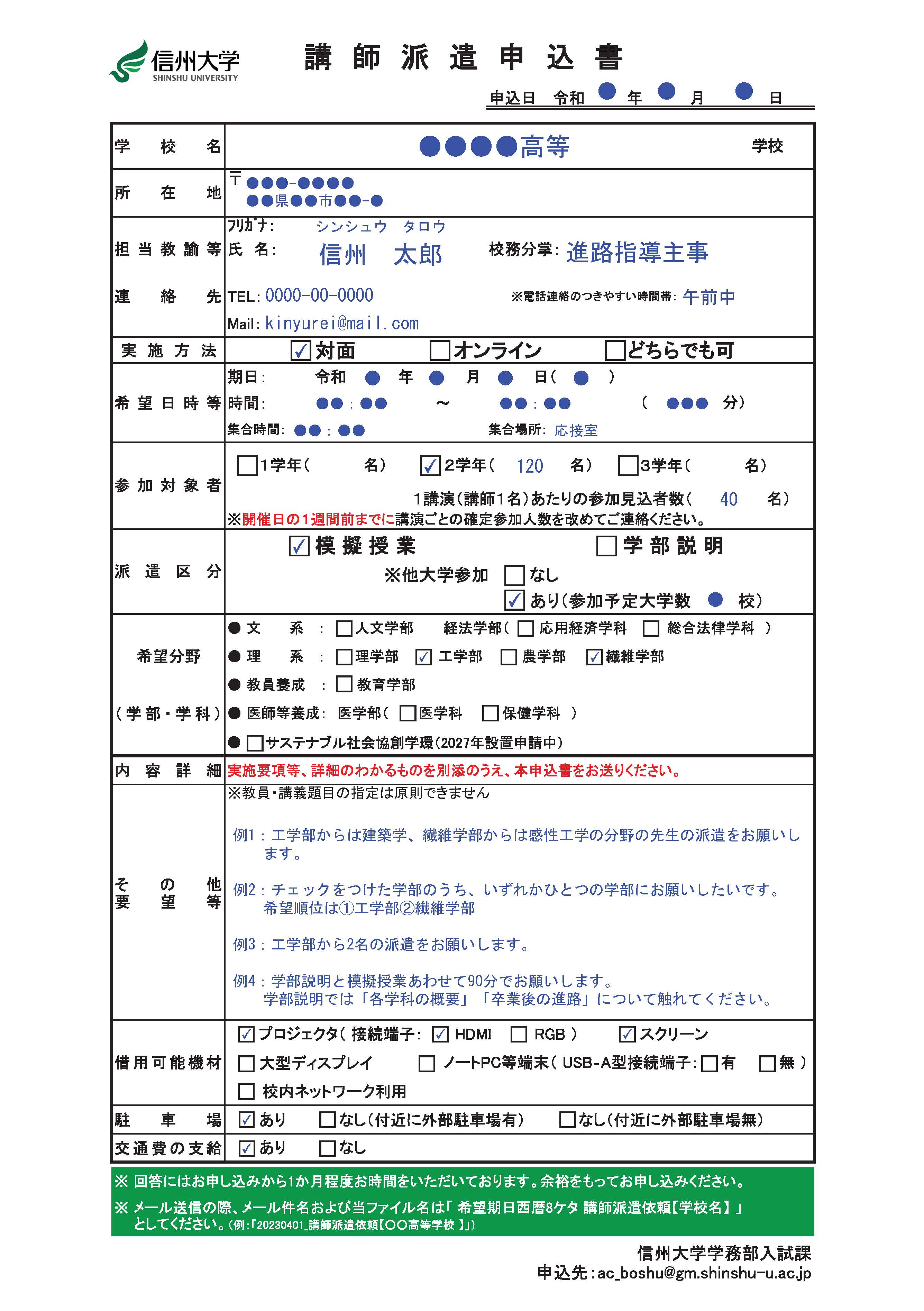 ※メール送信の際、メール件名および申込書ファイル名は「 希望期日西暦8ケタ_講師派遣依頼【学校名】 」としてください。
