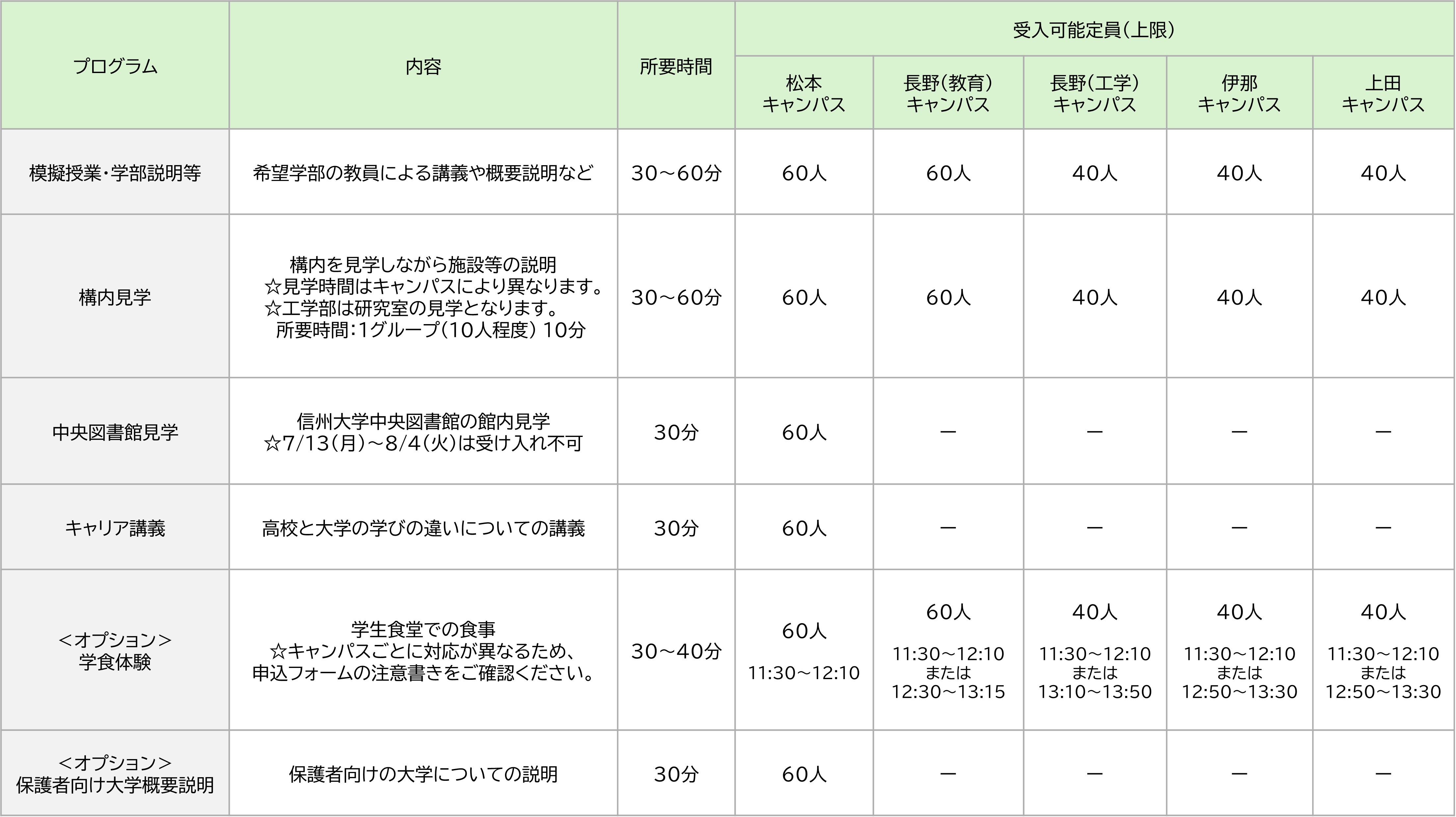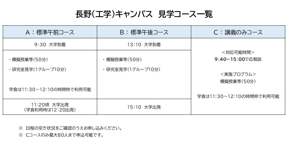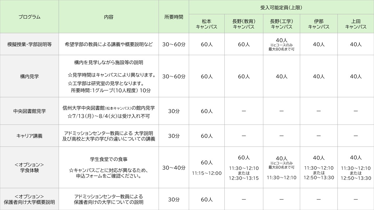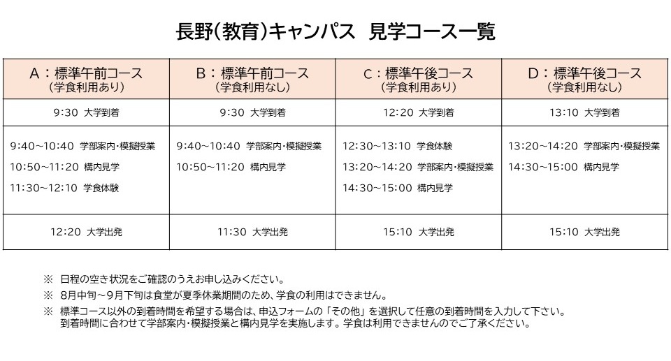 ○ 個人単位での見学について、各キャンパス内(屋外)は自由に見学ができますので、事前にご連絡やお申し込みをいただく必要はありません。 信州大学学務部入試課 TEL 0263-37-2192 FAX 0263-37-2182