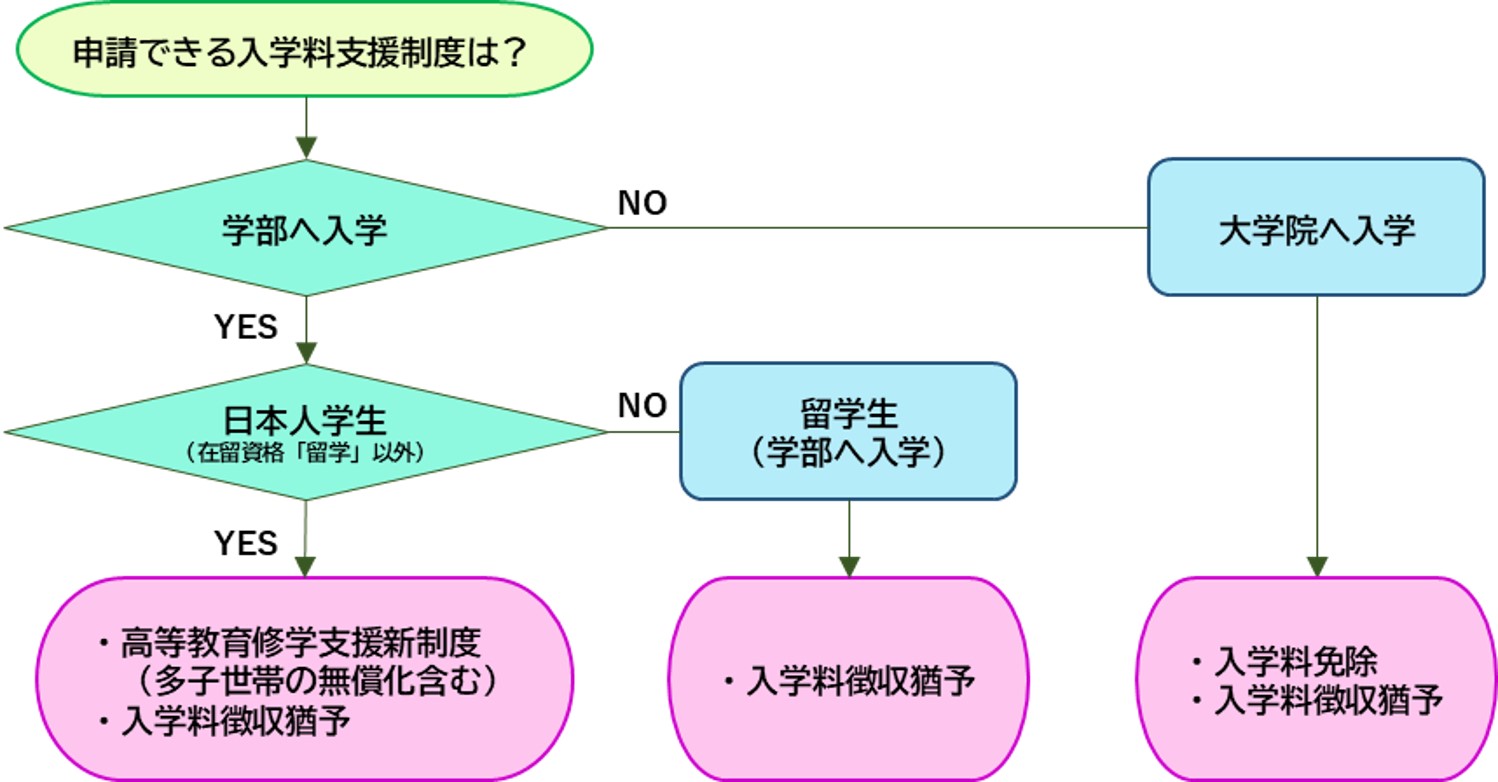 ※学部入学者は、高等教育修学支援新制度に一本化されているため、大学独自の入学料免除は実施しません。なお、入学料徴収猶予は申請可能です。