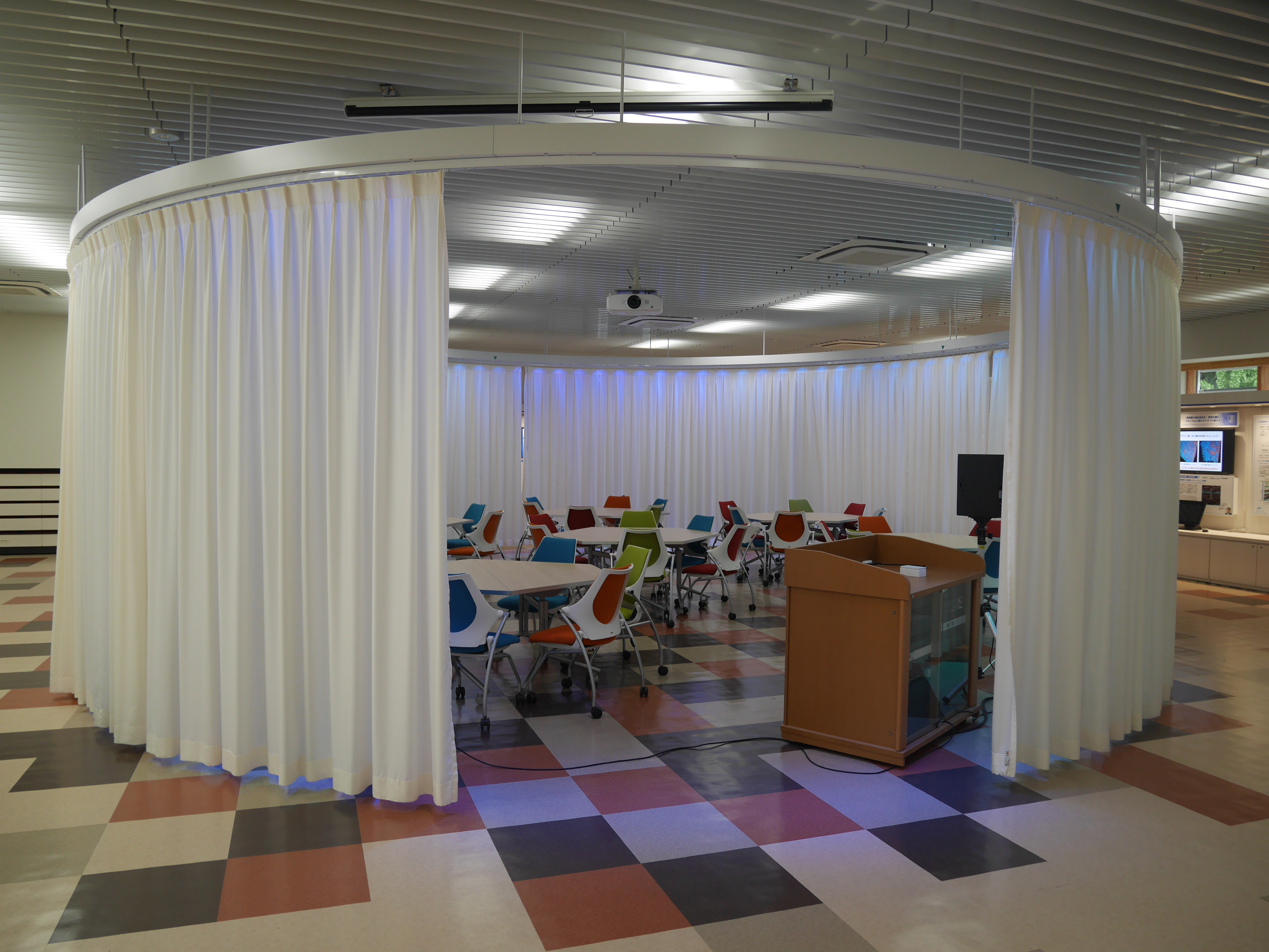 オーバルスタジオは、白いカーテンで仕切られた楕円形の空間に、グループワーク用の6角形のテーブルといすが並び、多様な意見を出し合うワークショップ専用のスタジオとして作られました。カーテンレールに沿って配置された98個のLED電球が、さまざまな色に空間を彩るユニークな演出は国内初の試みで、同じくセンター2階に設置されたスクエアスタジオとともに、新たなイノベーションの創出を目指すワークショップスペースとして期待されています。