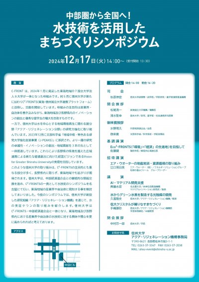 今般のシンポジウムでは、東海地域及び長野県内における産業界や自治体等に対して、本学が持つ卓越した水関連の研究技術に一層関心を高めてもらうこと等を目的とし、C²-FRONTSとの共催、中部経済連合会の後援にて「中部圏から全国へ!水技術を活用したまちづくりシンポジウム」と題して水のシンポジウムを開催する運びとなりましたので、ご案内いたします。