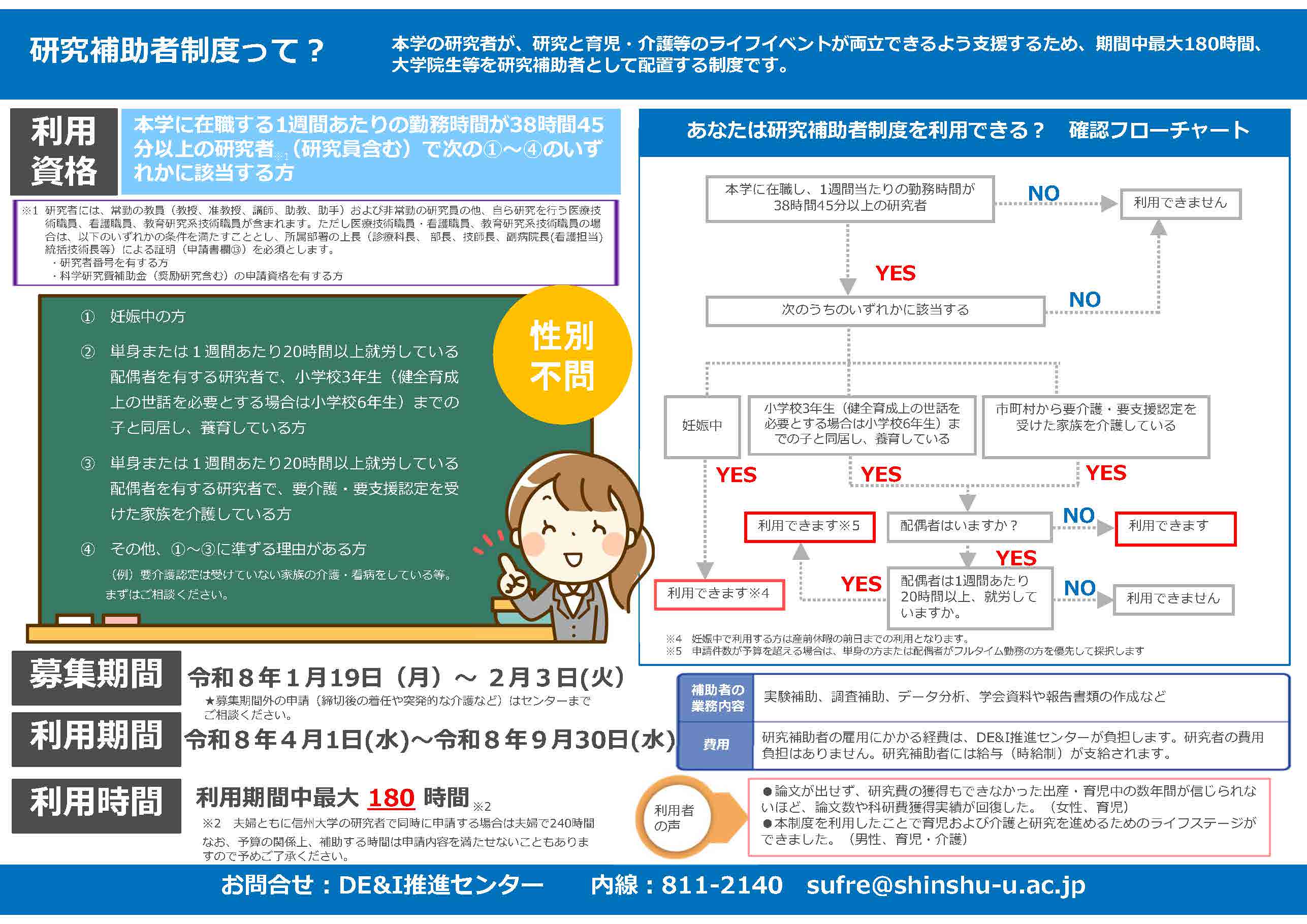 費用 研究補助者の雇用にかかる経費は、DE&I推進センターが負担します。研究者の費用負担はありません。研究補助者には給与(時給制)が支給されます。