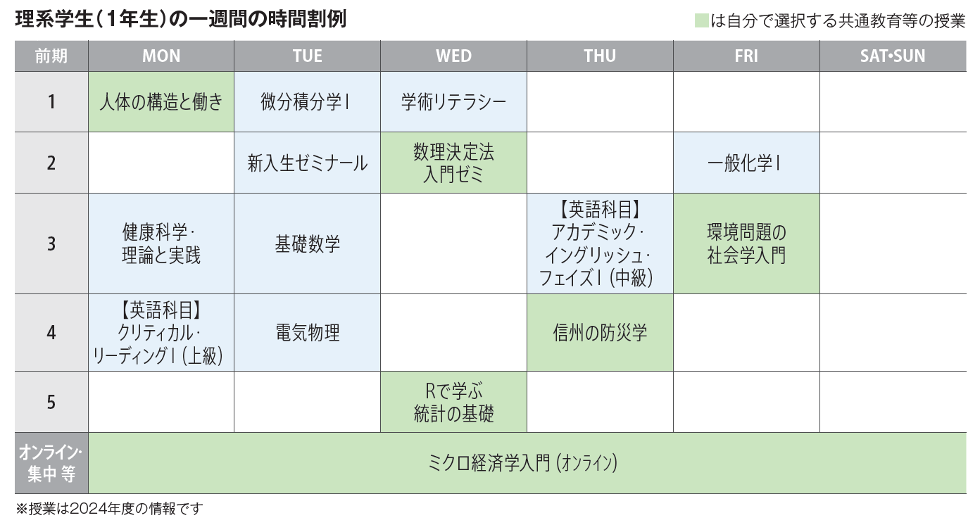 - 数理科学の世界、物理学の世界、化学の世界、生物学の世界、地学の世界、工学入門、情報学入門の7科目からなる