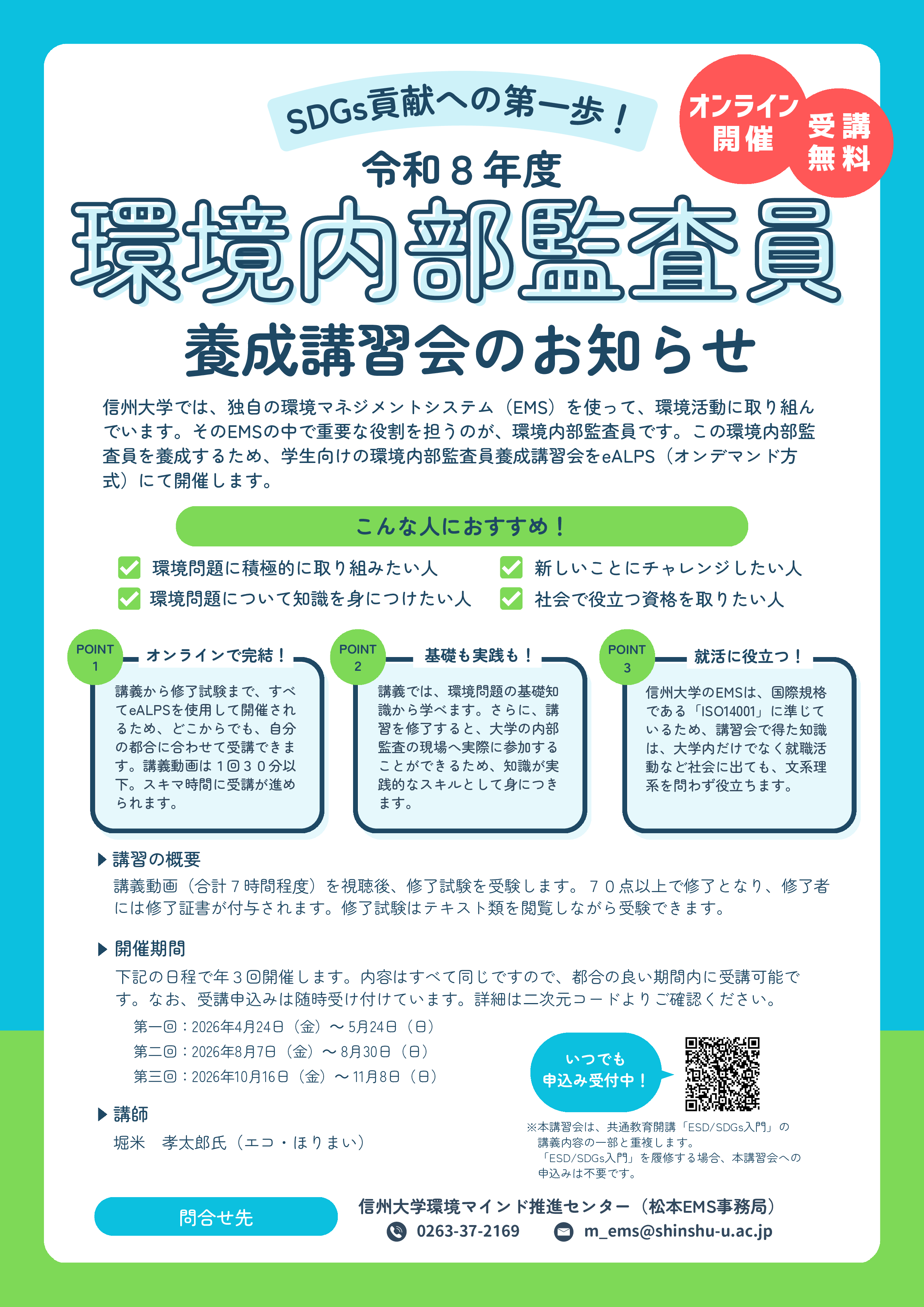 信州大学環境マインド推進センターでは、信州大学の学生に向けて、令和8年度 環境内部監査員養成講習会を開催します。 eALPSを利用したオンライン開催のため、すべての学部・学年、院生の方にご受講いただけます。 皆さんの積極的な受講をお待ちしています。 ※教職員向け講習会は別途開催予定です