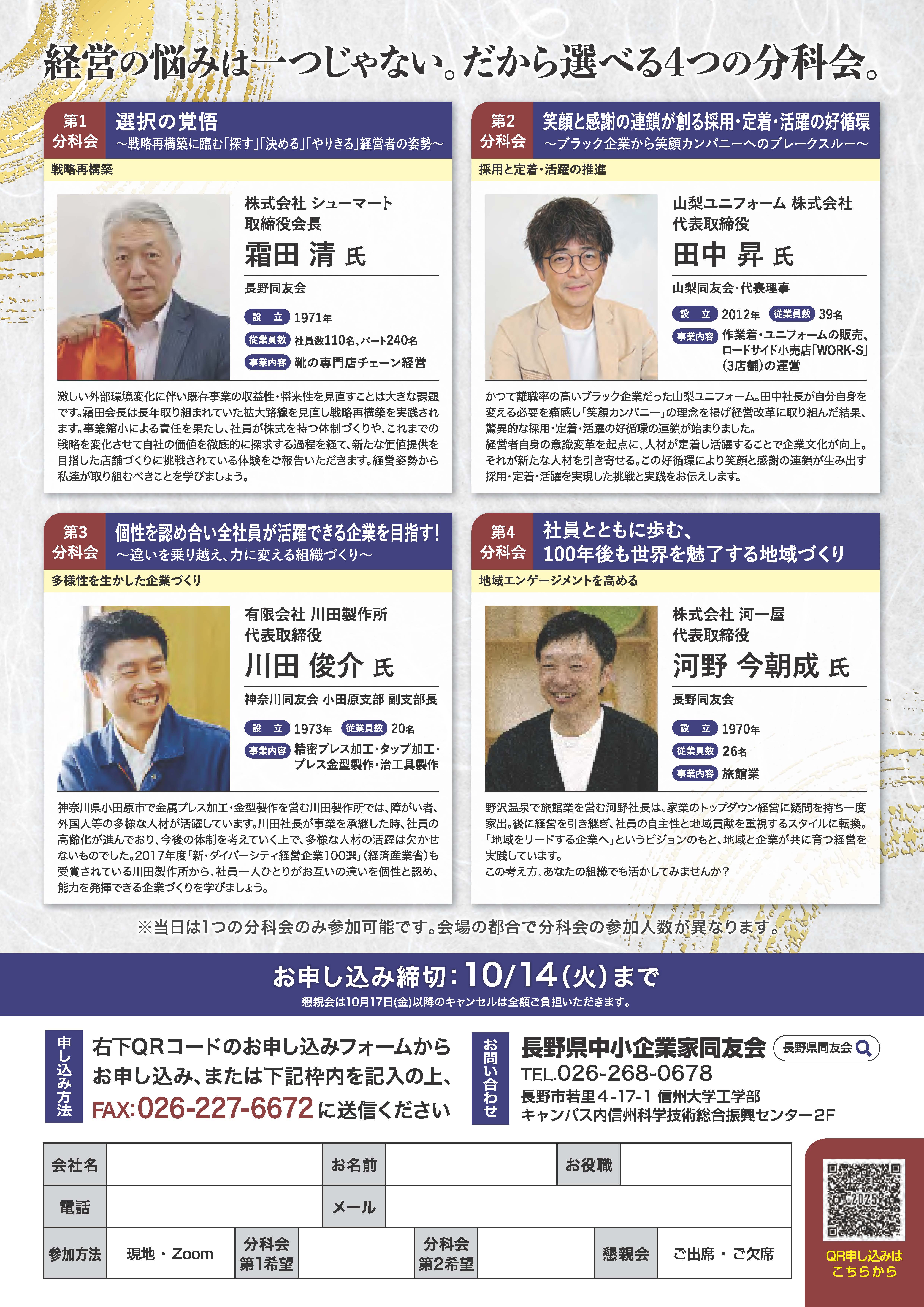 WEB 松本 企業・研究者 在学生 2025年10月9日(木) 2025 中小企業経営フォーラム(共催:キャリア教育・サポートセンター) シェア ツイート LINEで送る メールで送る 印刷する 日時 10月21日(火)12時~ 参加費 学生無料 会場 信州大学松本キャンパス経法学部 第2講義室/Zoom(報告のみ) 申し込み締め切り 10月14日(火)/お申し込みはこちら→【申し込みフォーム】 キャリアの授業の一環で実施しますが、受講生以外も参加可能です。 詳細は画像もしくは以下のPDFファイルをご覧ください。 2025中小企業経営フォーラム.pdf イベント一覧に戻る