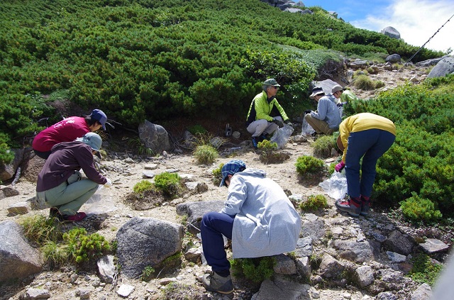 3日目は西駒山荘にて管理人の宮下拓也氏の熱心な指導の下,天気図の作成を3時間余りかけて行い,今後の天候について検討した。その後,山小屋をめぐる諸問題の体験活動として,西駒山荘周辺のゴミ拾いを実施し,地面に半ば埋もれた古い金属・ガラス・プラスチック等のさまざまなゴミを収集することができた。11時ごろに西駒山荘を後にした。ひきつづき天候に恵まれたため,予定どおり下山ルートとして演習林内の登山道(丸尾根ルート)を進み,温暖化試験地,固定試験地の見学・観察を実施した。しらべ平に14時過ぎ,桂小場学生宿舎に16時過ぎに帰着した。