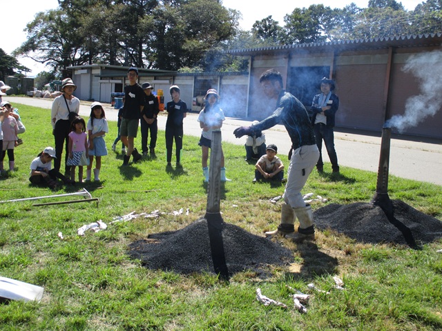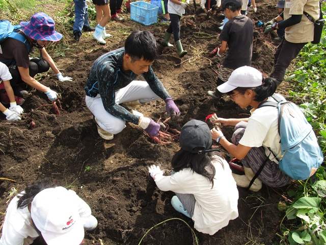第5回の9月27日は、サツマイモ掘り、稲刈り 焼き芋を実施しました。5月に苗を定植したサツマイモ「紅あずま」の収穫では、土を手で丁寧に取りながら大きく育ったサツマイモがたくさん収穫できました。