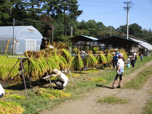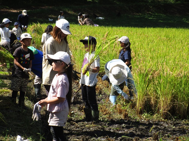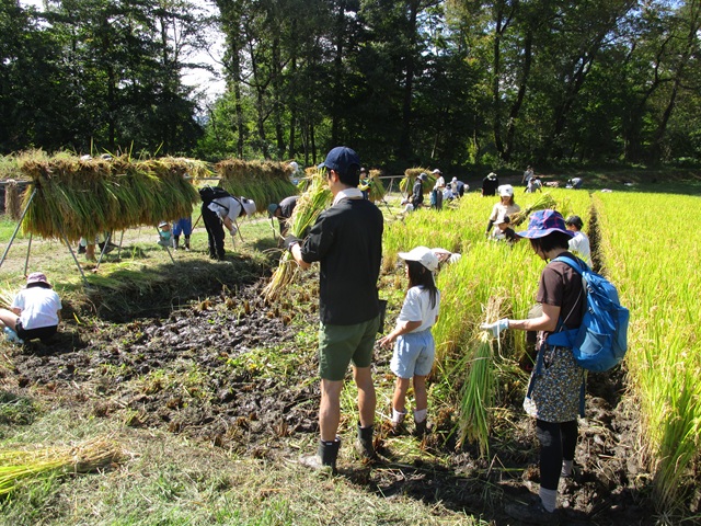 5月に田植えをした「風さやか」の苗も、大きく育っていました。最初は初めて行うはざ掛けに苦戦する様子もありましたが、全員で協力して1時間程で稲刈り・はざ掛けを完了することができました。