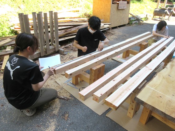 各種の木材加工の道具・機械を用いて演習林のヒノキ間伐材を加工し、一定の構造物を作製する。そして、基礎的な木材加工技術を修得するとともに、樹木が生命活動によって生産する生物材料である木材の構造と性質について理解することを目指す。