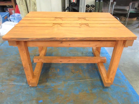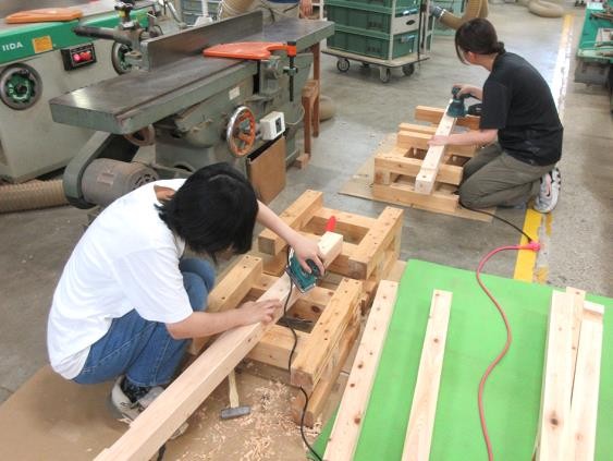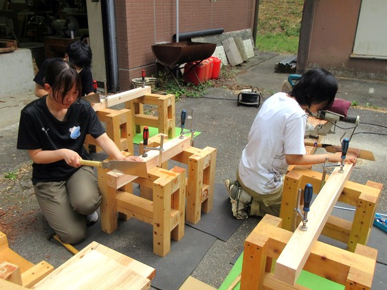 まず、ランダムサンダー、ミニサンダーを用いて、前日に組み立てが終了した机の最終的な仕上げ作業を行った。続いて、塗装工程の説明を行い、コンプレッサーで机の埃を吹き飛ばした後に塗装作業を行った。塗料には屋外用木部保護塗料を用い、塗装は刷毛塗りで行った。その後、机作製の過程で発生した端材を利用して、小物作製を行った。そして、最後に授業アンケートおよび閉講式を実施し、演習の全日程を終了した。