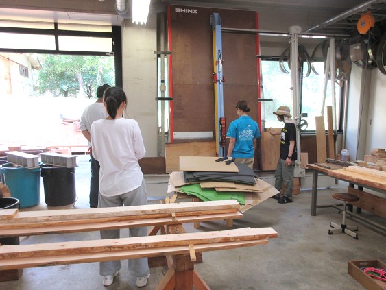初めに開講式を行い、続いて安全講習を行った後、木材の構造と性質についての講義を行った。次に、木工機械の説明を行った後、製材機を使用した製材デモンストレーションを行い、その中で材の完満度、歩留りなど、演習で使用する丸太について説明を行った。その後、作製する構造物(机)の説明を行った。今年度は、手良沢山演習林で間伐されたヒノキから製材した心持ち正角材と板材に加えて、松本キャンパスで伐採されたヒマラヤスギから製材した板材も使用することとした。作製物の説明後、過去の受講生が作製した机を見学し、必要に応じて机の採寸を行った。そして、心持ち正角材と板材に残っていた樹皮を除去する皮むきの作業を行い、皮むきした各材料の自動かんな盤加工を行った。この自動かんな盤加工を行った材料を用いて、机を作製することとした。その後、机の図面を作成し、1日目の演習を終了した。