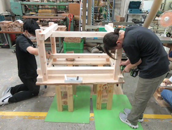 2日目に引き続き、鋸、インパクトドライバー、木工用ドリル、鑿を用いて仕口の加工を行った。そして、接合部分の調整を行った後、脚部と天板の仮組を行った。次に、電動工具の説明を行った後、ランダムサンダー、ミニサンダーを用いて各部材の仕上げを行った。その後、インパクトドライバー、木工用ドリル、下穴錐、コーススレッドなどを用いて脚部の組み立てを行った。脚部の組み立て後、同じ道具を用いて天板の取り付けを行い、3日目の演習を終了した。3日目にしてほぼ完成形ができ、良好な進行状況となった。
