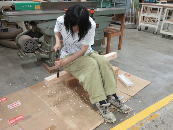 まず、1日目に作成した机の図面をもとに木取図を作成した。次に、手道具の説明を行った後、作成した木取図を用いて天板、脚部などの各部材の木取作業を行った。続いて、スライド丸鋸とパネルソーの説明を行い、実際にそれらを使用して正角材と板材を各部材に切り分けた。その後、鋸、インパクトドライバー、木工用ドリル、鑿を用いて仕口の加工を行った。各部材への切り分けはすべて終わったが、仕口の加工は終わらなかったため、3日目に続きを行うこととし、2日目の演習を終了した。