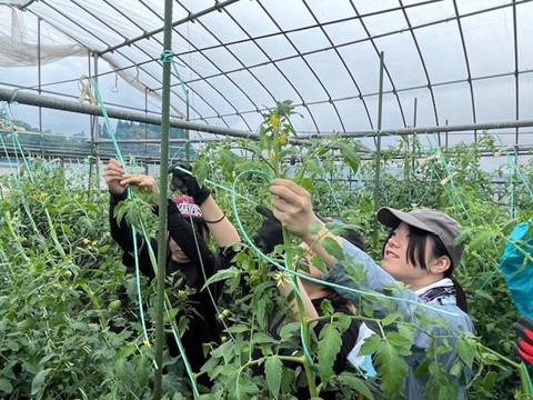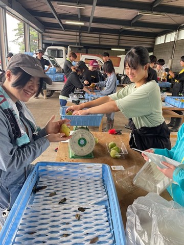 JA箕輪果樹選果場へ行き、果樹の農家からの出荷・機械による選果・箱詰め等を見学し、リンゴの食べ比べをさせていただいた。また、ナシやブルーベリーの収穫、リンゴや夏秋イチゴの管理、シクラメン葉組み、スイートコーン圃場の片づけ、ネギやケールの収穫なども行った。最終日には、リンゴやナシなどの販売用パッキングも行い、生産から出荷までの一連の流れを経験した。