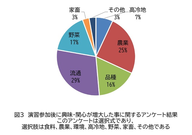 演習後に興味関心が増した事については高い順に、流通29%、農業25%、野菜17%、品種16%、高冷地7%、家畜3%、その他3%という回答結果になった(図3)。今までの実習や演習では時間やタイミングの都合上触れられなかった部分(収穫から包装まで)を行ったことや、農家が収穫した果樹が選果場へ運ばれ、実際に選果され、段ボールに梱包され、トラックで各地に運ばれているという流れを選果場での見学で触れたことで、流通や農業への興味が高かったのではないかと考えられる。