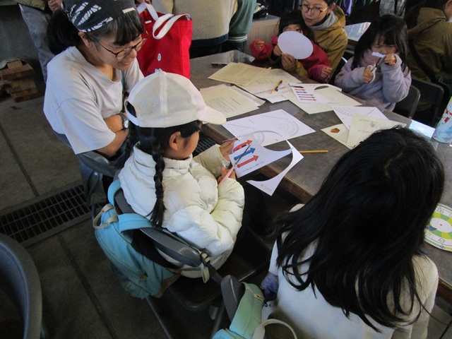 森林体験では最初に教室内で、画用紙に印刷された文字盤と針からアナログ時計を、分度器にストローと錘をつけた樹高測定器を製作しました。