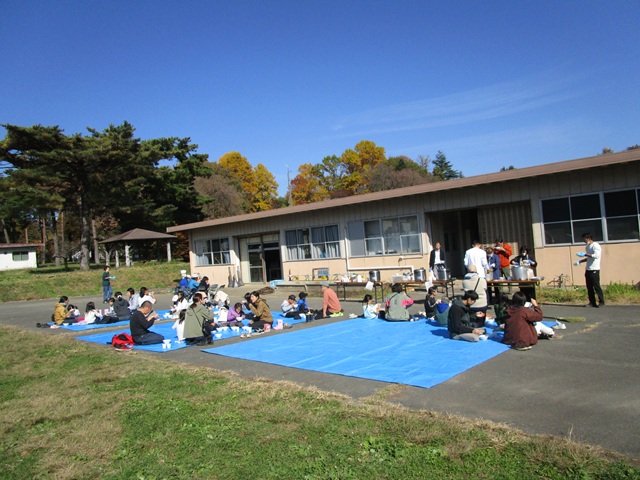 最後に、体験講座で田植えと収穫を行ったお米を、秋晴れの空の下、豚汁と一緒に試食しました。