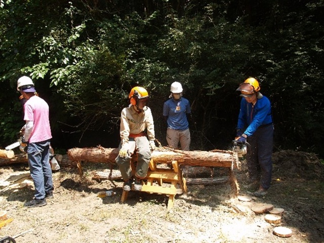 3日目は午前中に人工林の育成に関する講義、森林作業の安全教育等の座学を行った後、チェンソーで丸太切り、薪割りを体験した。受講生からは、チェンソーの扱いや維持が想像以上に難しくて驚いた、チェンソーの力の入れ具合が分かった、チェンソーをたくさん使えて楽しかった、薪割りは重労働だと実感した、薪割りが予想以上に難しかった、チェンソーも薪割りも楽しかった、等の感想が得られた。午後はヒノキ人工林において、間伐の効果を検証するための林分調査を行った。受講生からは、人工林の調査方法が学べたのでよかった、人工林の管理や間伐の重要性について学べた、毎木調査の経験が大変有意義だった、斜面が40°を超える急な角度で、作業の大変さを実感した、等の感想が得られた。この日の晩餐は、学生宿舎の前庭でバーベキューを行った。