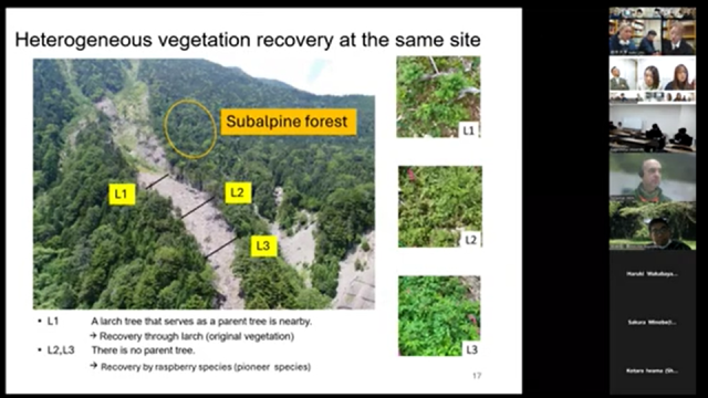 今年は「森林被害」をテーマに各校から2回ずつのプレゼンテーションが行われました。信州大学のテーマは能登半島地震における「深層崩壊」と2017年の南アルプスにおける「大規模雪崩」です。それぞれのテーマを扱っている信州大学の教員、先輩、卒業生へのインタビューを踏まえて問題点を洗い出し、解決策に踏み込んだプレゼンテーションを作成しました。いずれもスケールが大きいことによる遷移系列の不均一さや、強度が大きいことによる再生の難しさが課題になります。ランドスケープ的なアプローチや生態工学的なアプローチの必要性も提起されました。